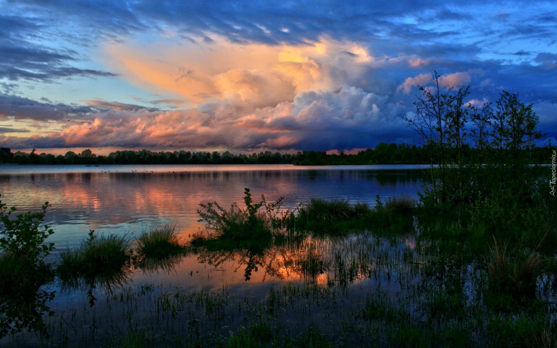Edytor tapety: Jezioro, Zarośla, Lasy, Kłębiaste, Chmury, Zmrok