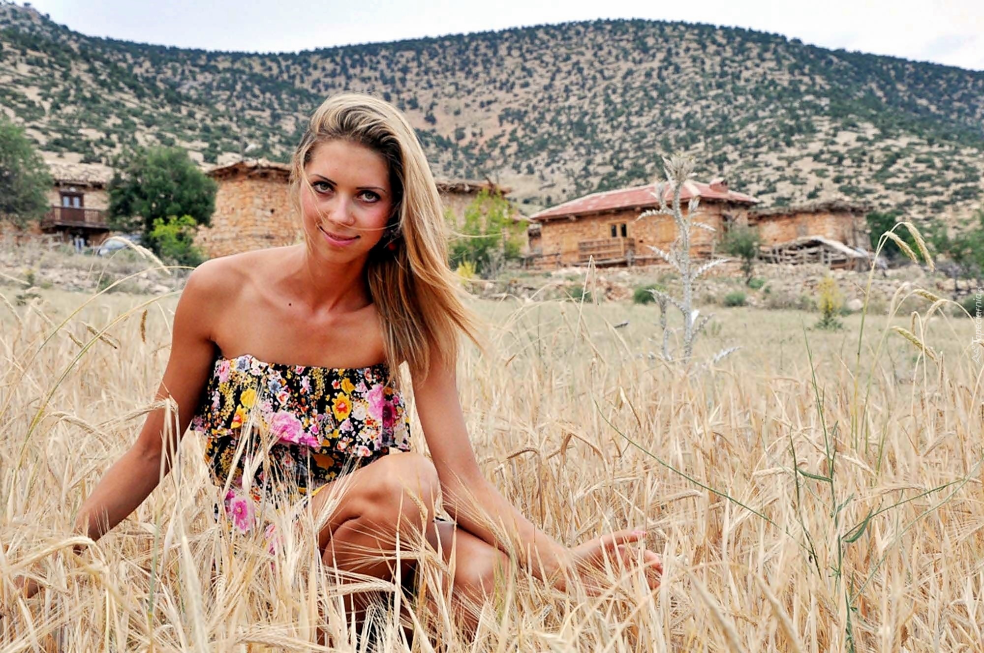Edytor tapety: Dziewczyna, W Zbożu, Domy, Wzgórza, Rozmycie