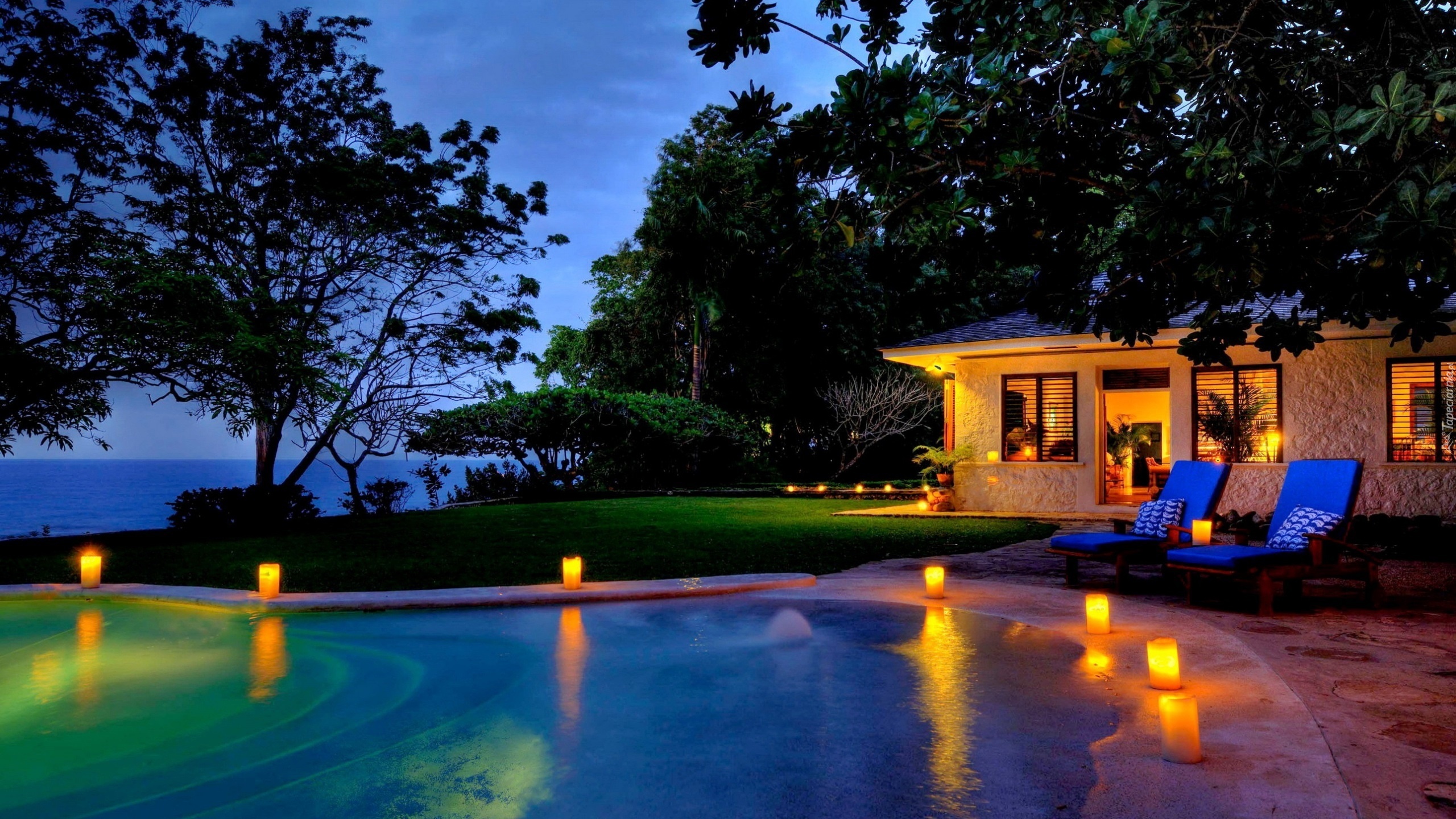 Edytor tapety: Oświetlony, Dom, Basen, Drzewa
