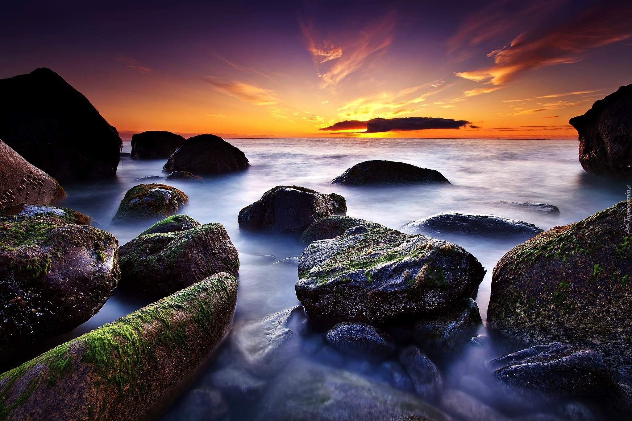 Edytor tapety: Zachód, Słońca, Kamienie, Morze