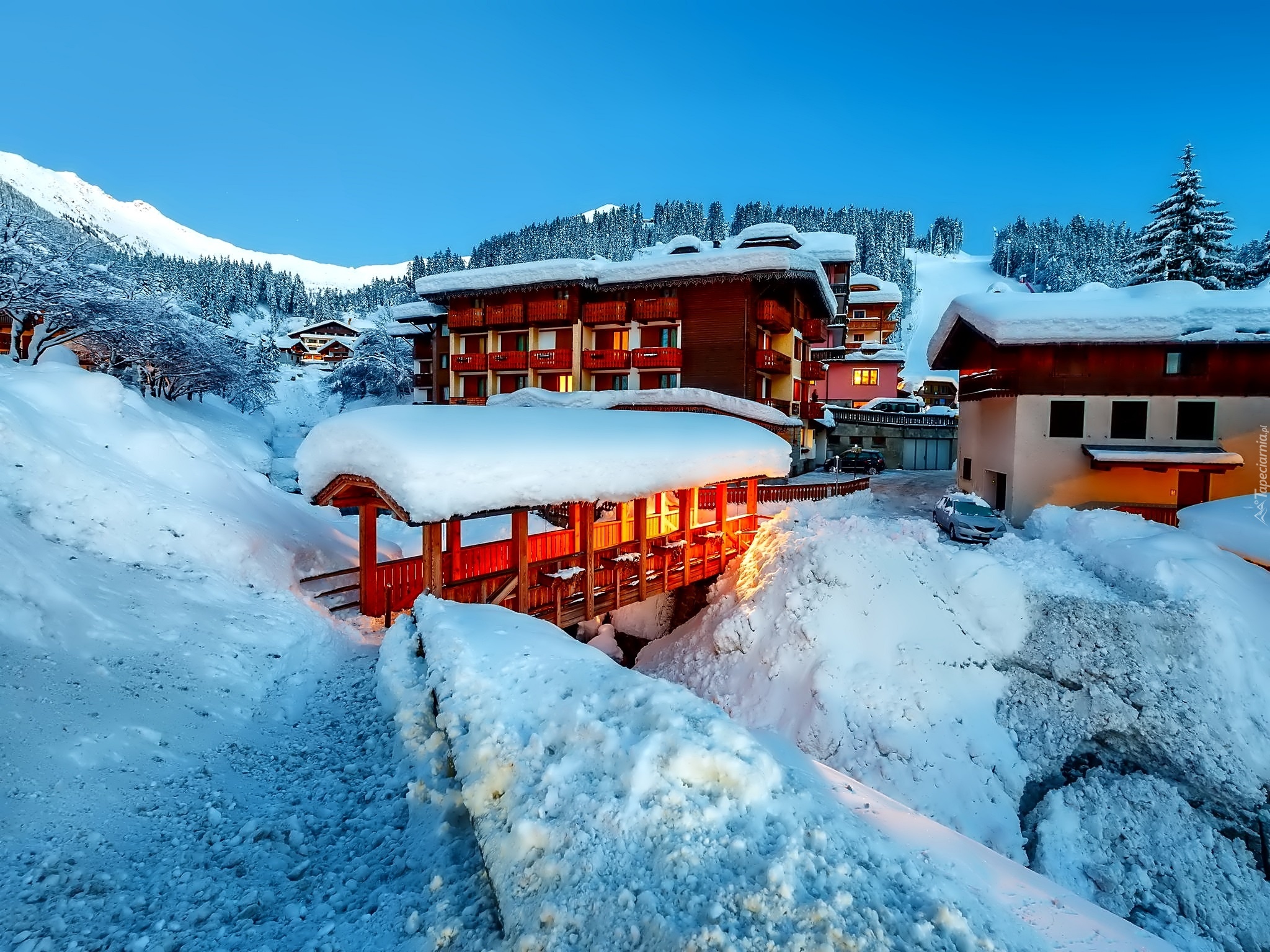 Edytor tapety: Zima, Góry, Ośnieżone, Domy