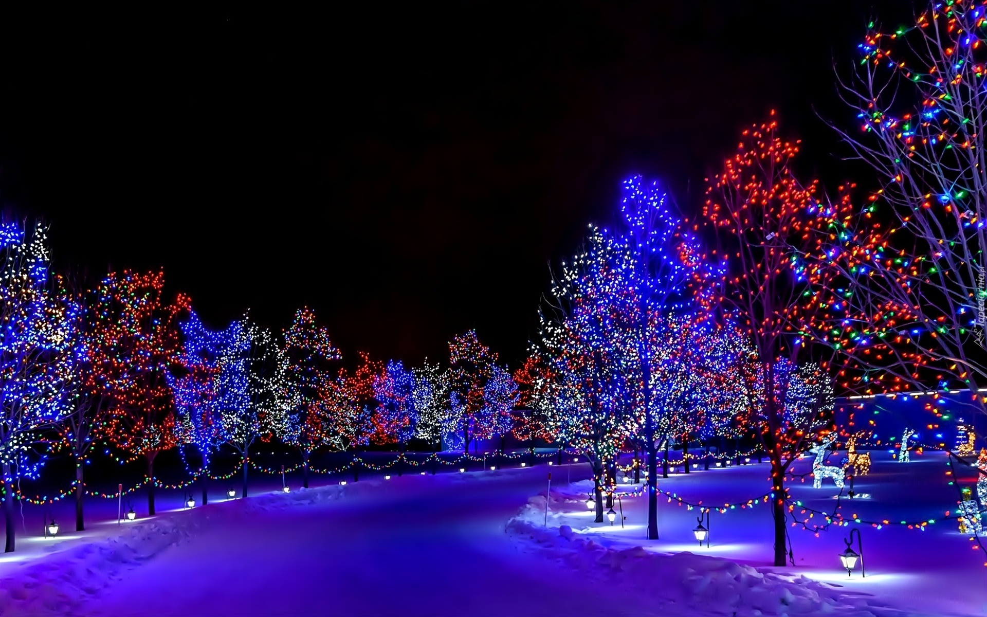 Edytor tapety: Oświetlona, Droga, Drzewa, Lampki, Zima
