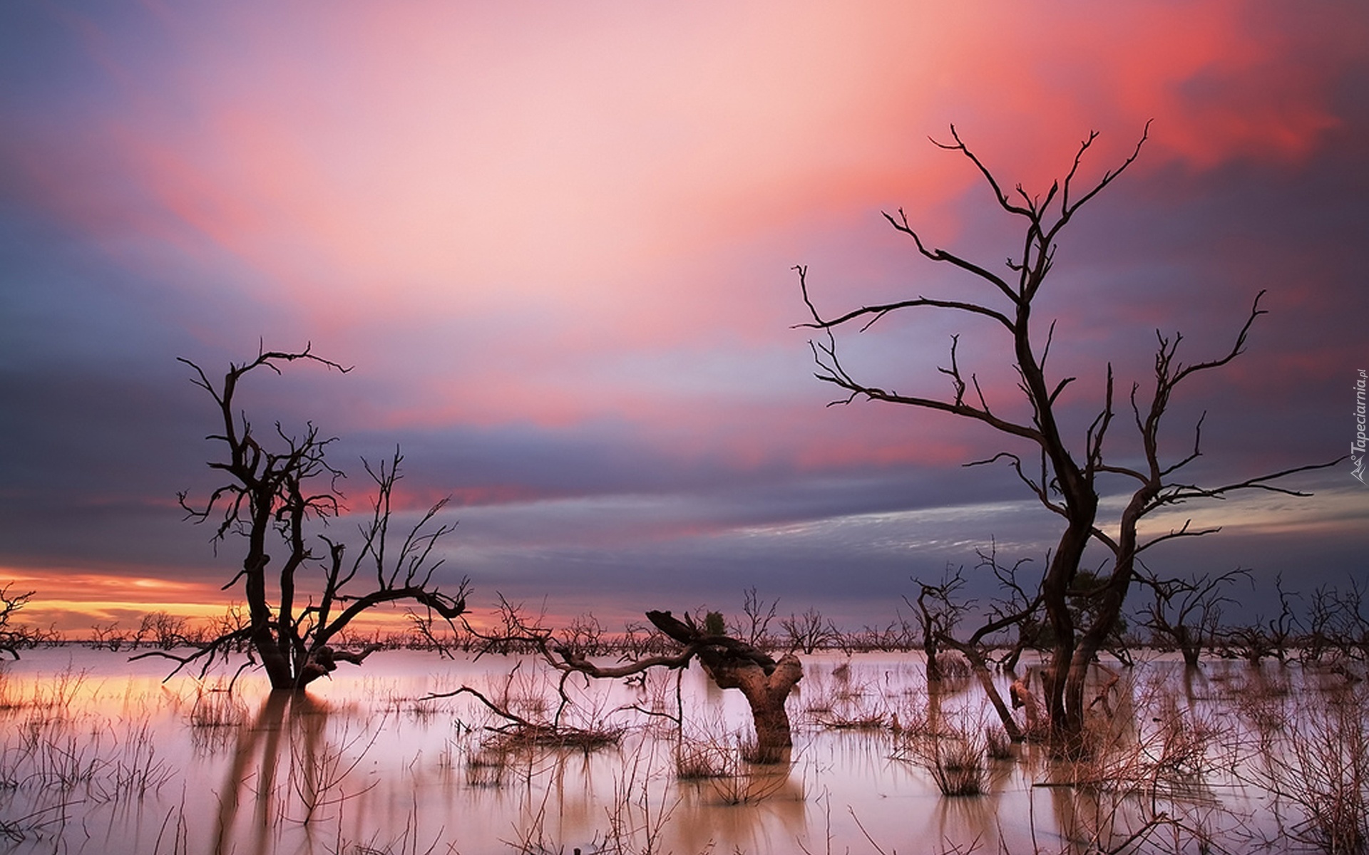 Edytor tapety: Bagno, Drzewa, Zachód Słońca