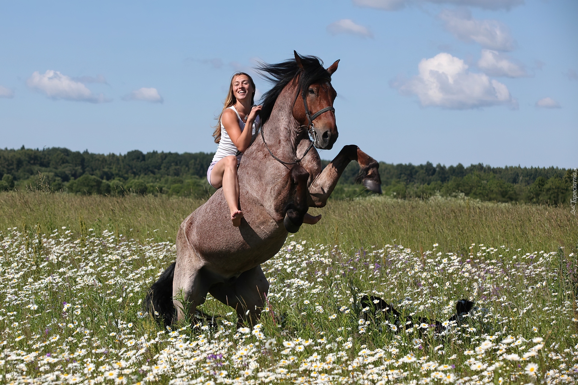 Edytor tapety: Kobieta, Koń, Łąka, Rumianki