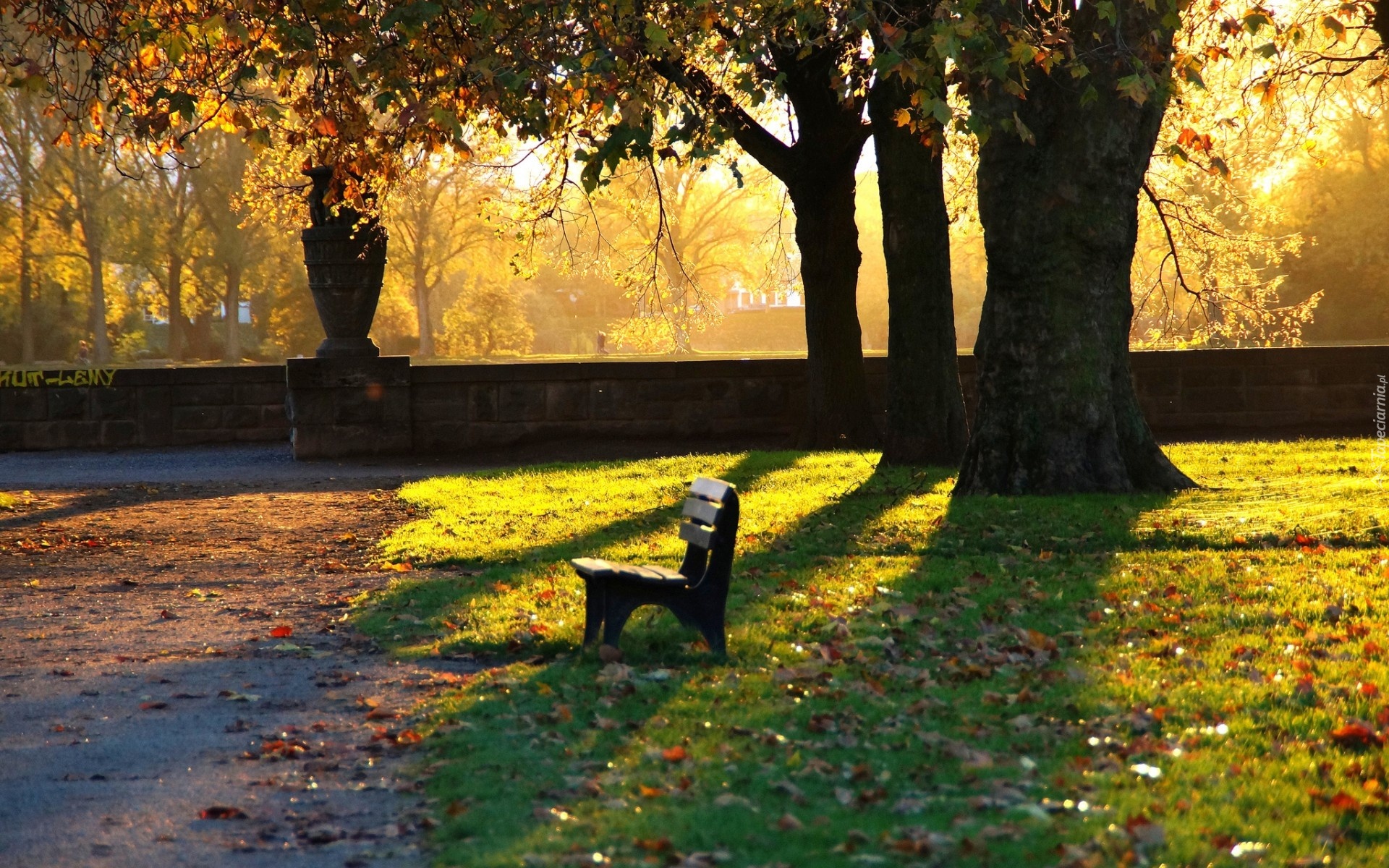 Edytor tapety: Park, Ławka, Alejki, Liście, Przebijające, Światło, Jesień