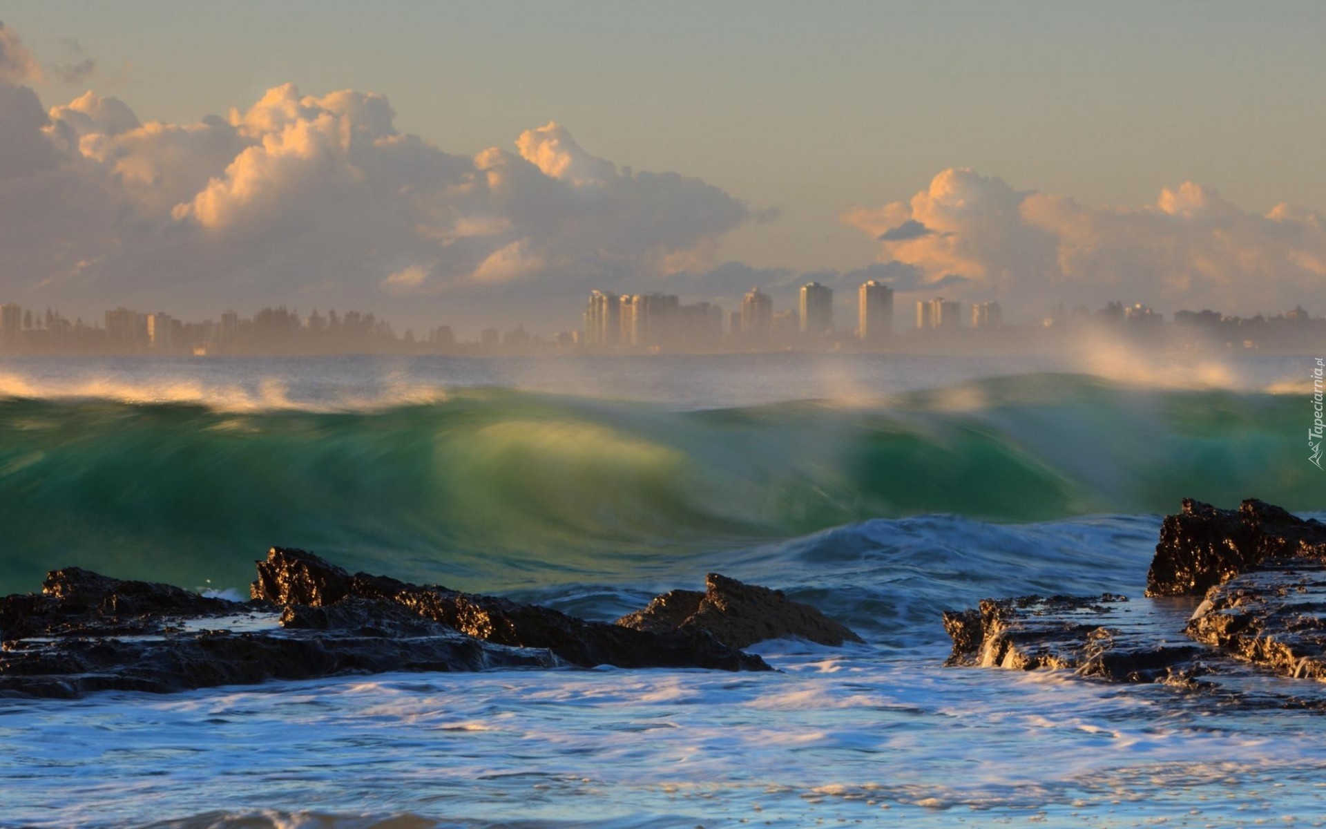 Edytor tapety: Wybrzeże, Fale, Skały, Wieżowce, Mgła, Chmury, Panorama
