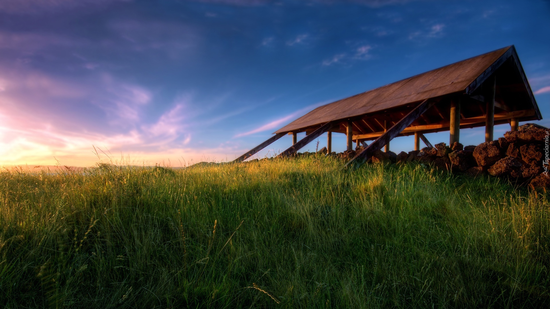 Edytor tapety: Łąka, Trawa, Niebo, Budynek