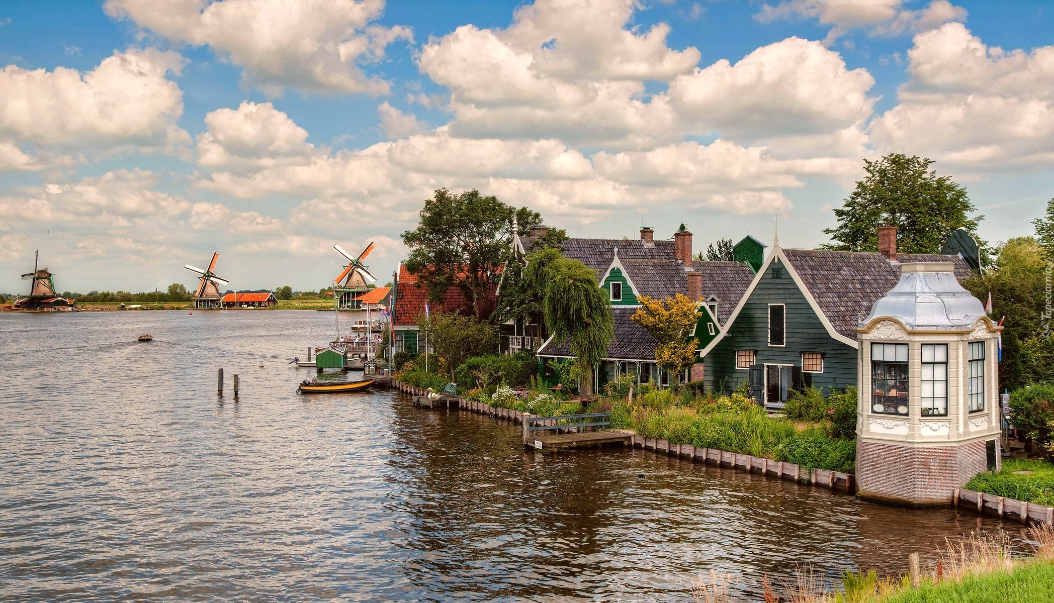 Edytor tapety: Rzeka, Domy, Wiatraki, Holandia