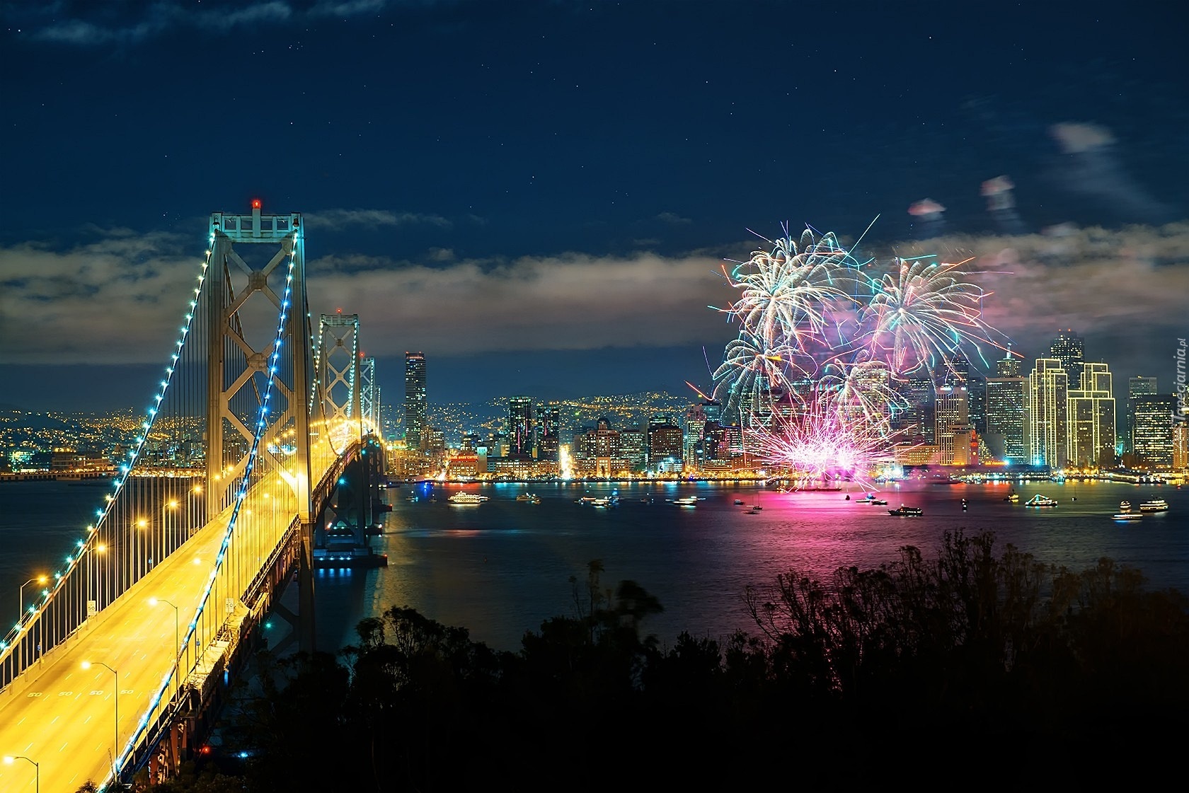 Edytor tapety: San Francisco, Most, Rzeka, Fajerwerki