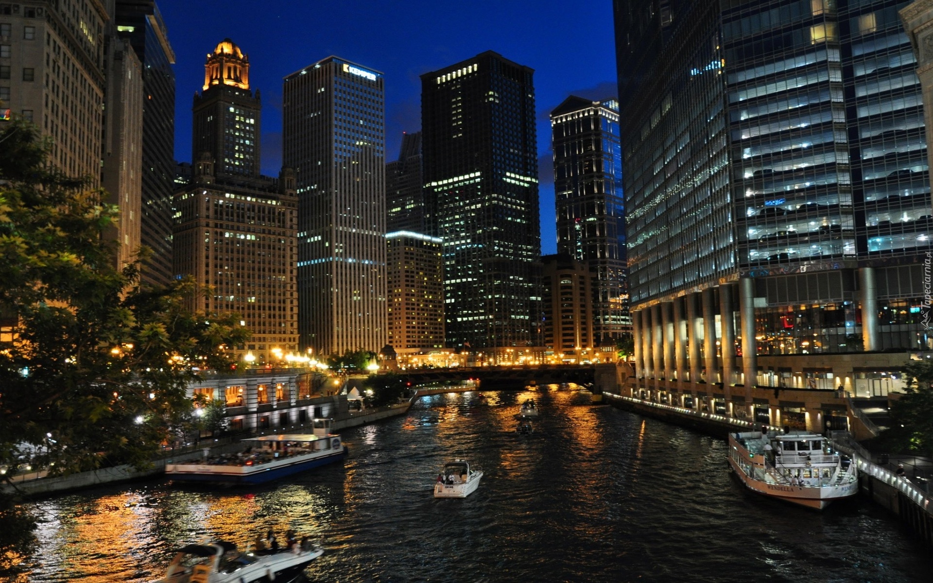 Edytor tapety: Drapacze, Chmur, Noc, Rzeka