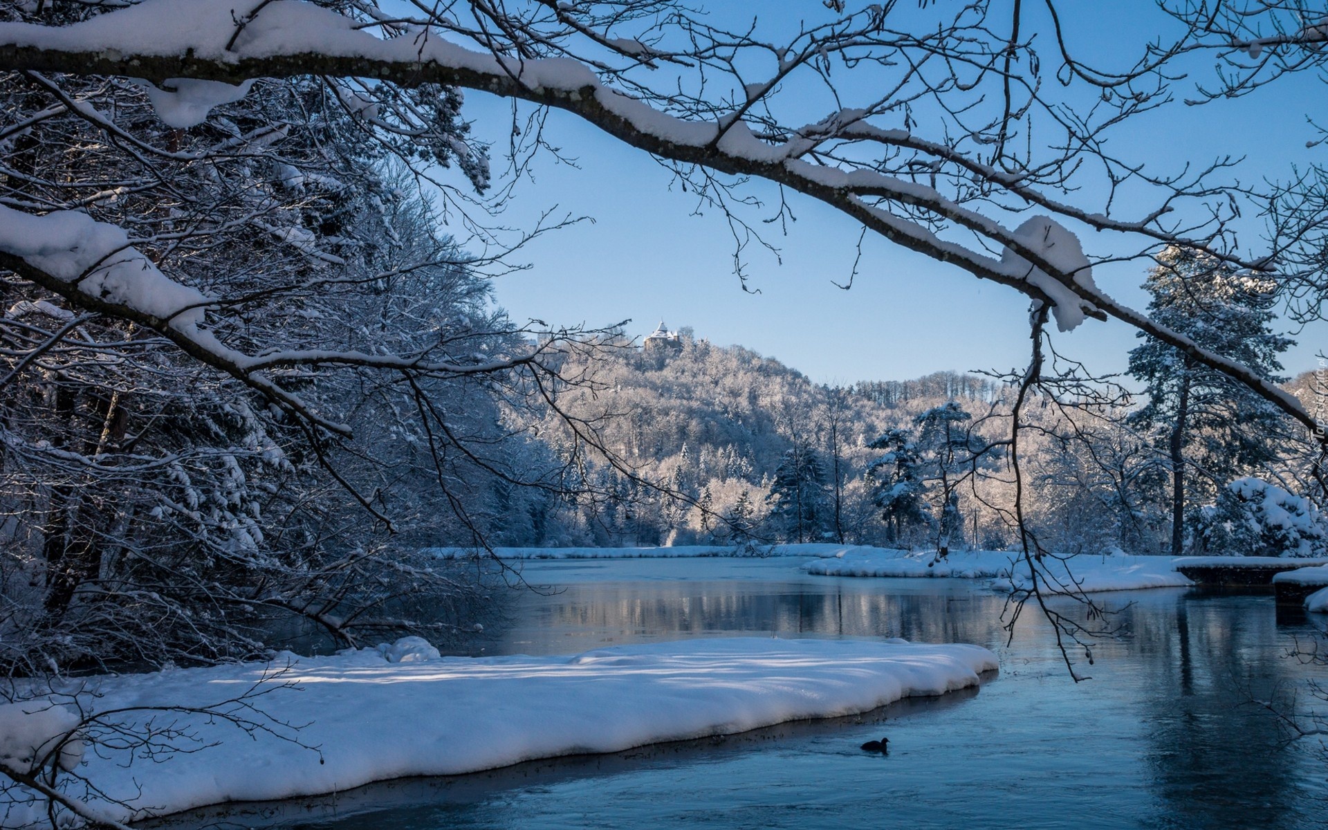Edytor tapety: Rzeka, Kaczki, Góry, Lasy, Zima