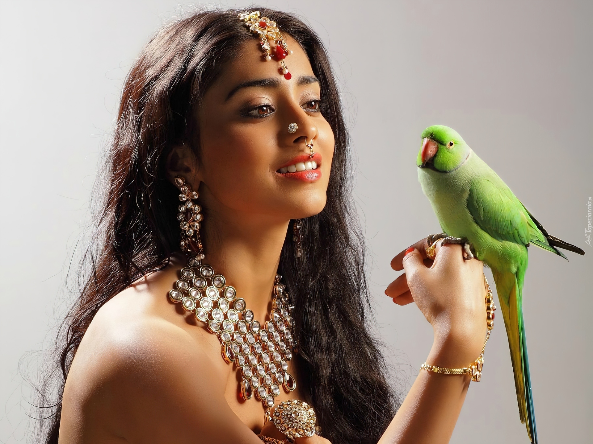 Edytor tapety: Piękna, Hinduska, Biżuteria, Makijaż, Zielona, Papuga