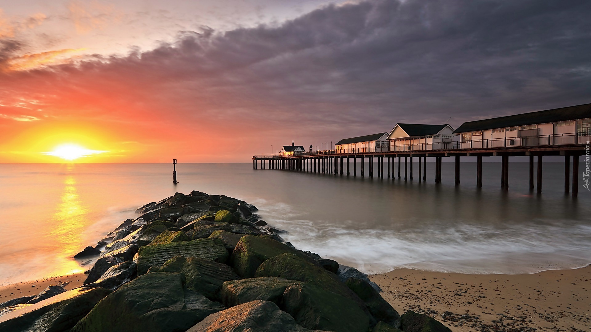Edytor tapety: Zachód, Słońca, Morze, Plaża, Domki, Molo
