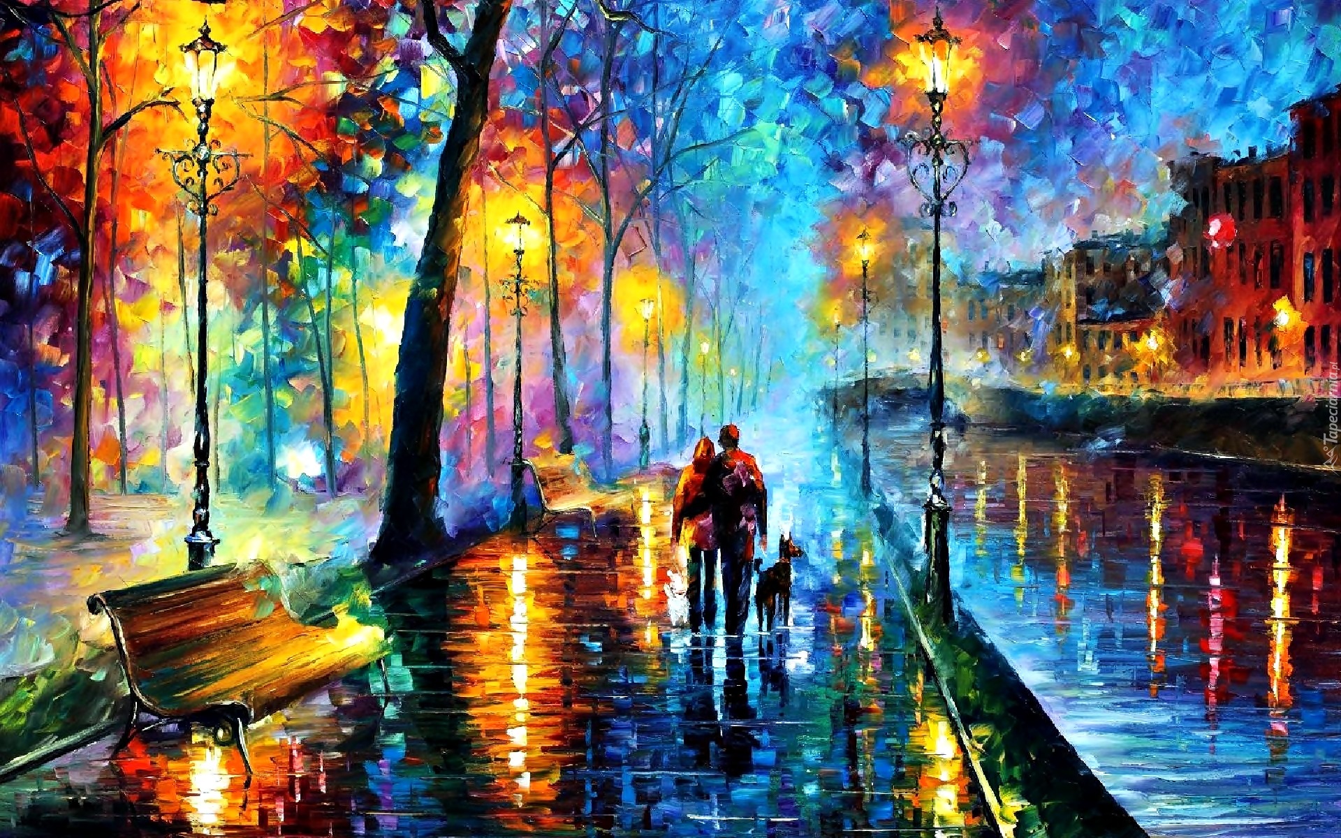 Edytor tapety: Obraz, Leonid Afremov, Ulica, Latarnie, Domy