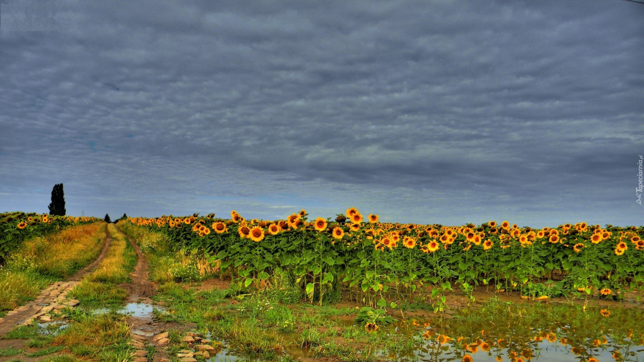 Edytor tapety: Pole, Słoneczniki, Kałuże, Droga