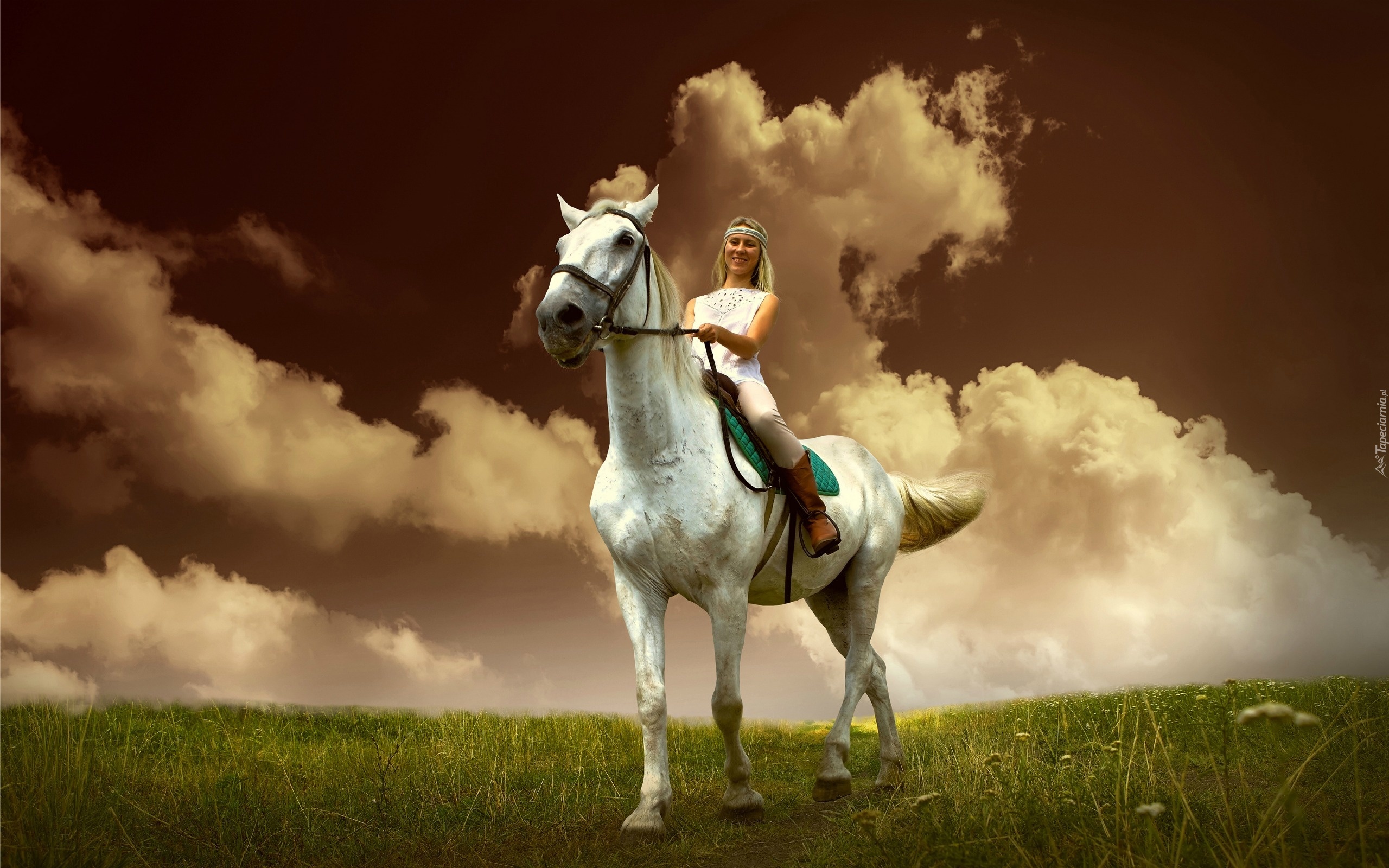 Edytor tapety: Blondynka, Koń, Łąka, Chmury
