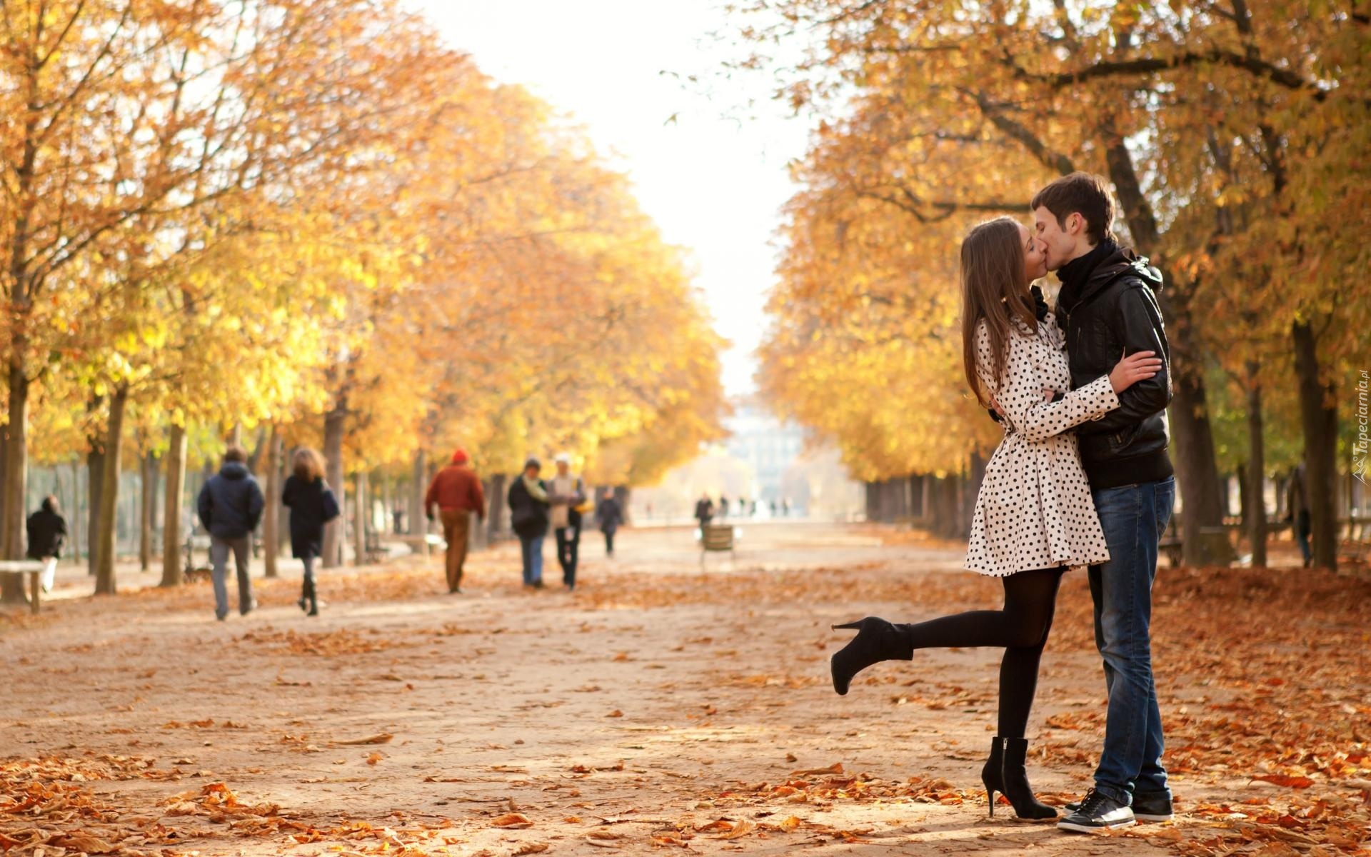 Edytor tapety: Park, Alejka, Liście, Kobieta, Mężczyzna, Pocalunek