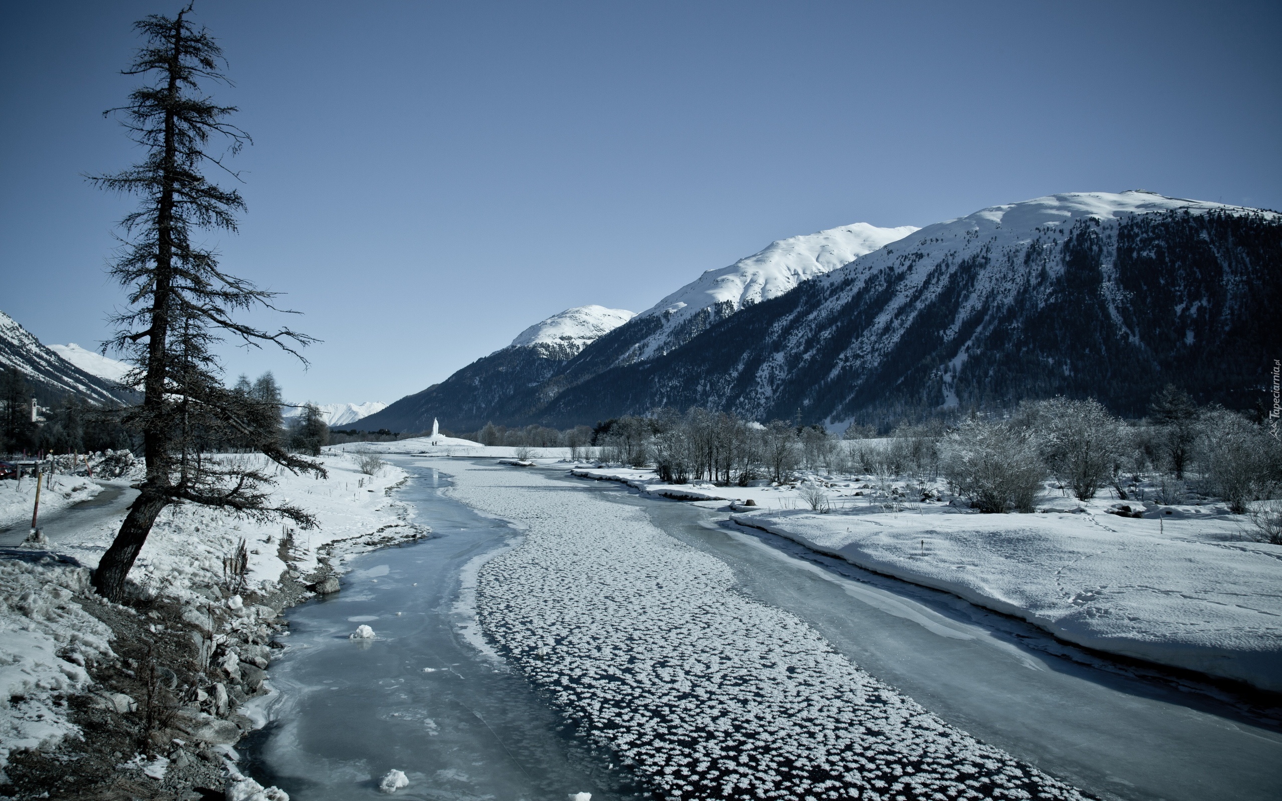 Edytor tapety: Góry, Rzeka, Śnieg, Lód, Drzewa