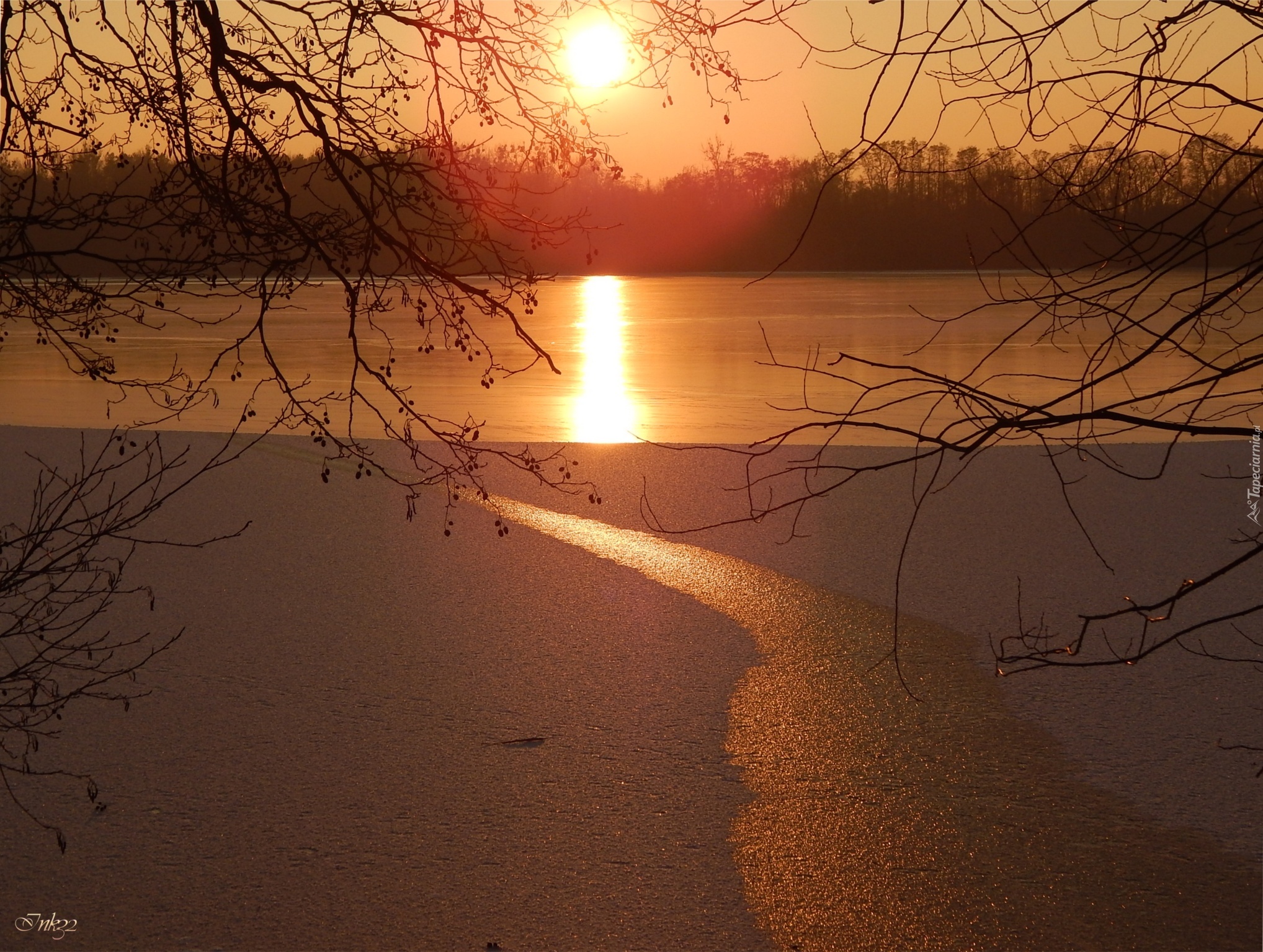 Edytor tapety: Zachód Słońca, Jezioro, Lód, Gałęzie