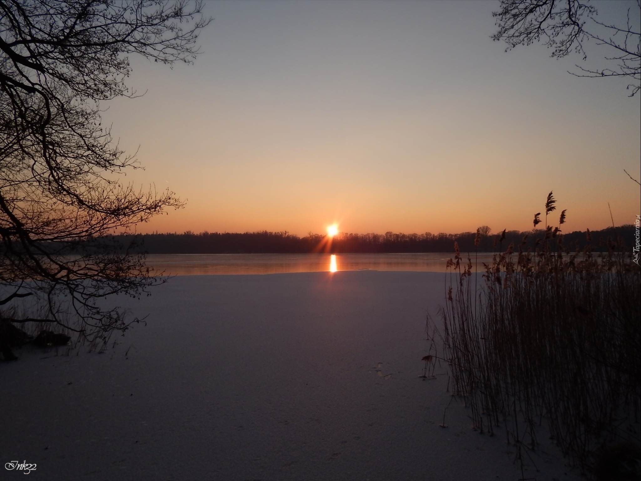 Edytor tapety: Zachód, Słońca, Jezioro, Lód, Trzciny