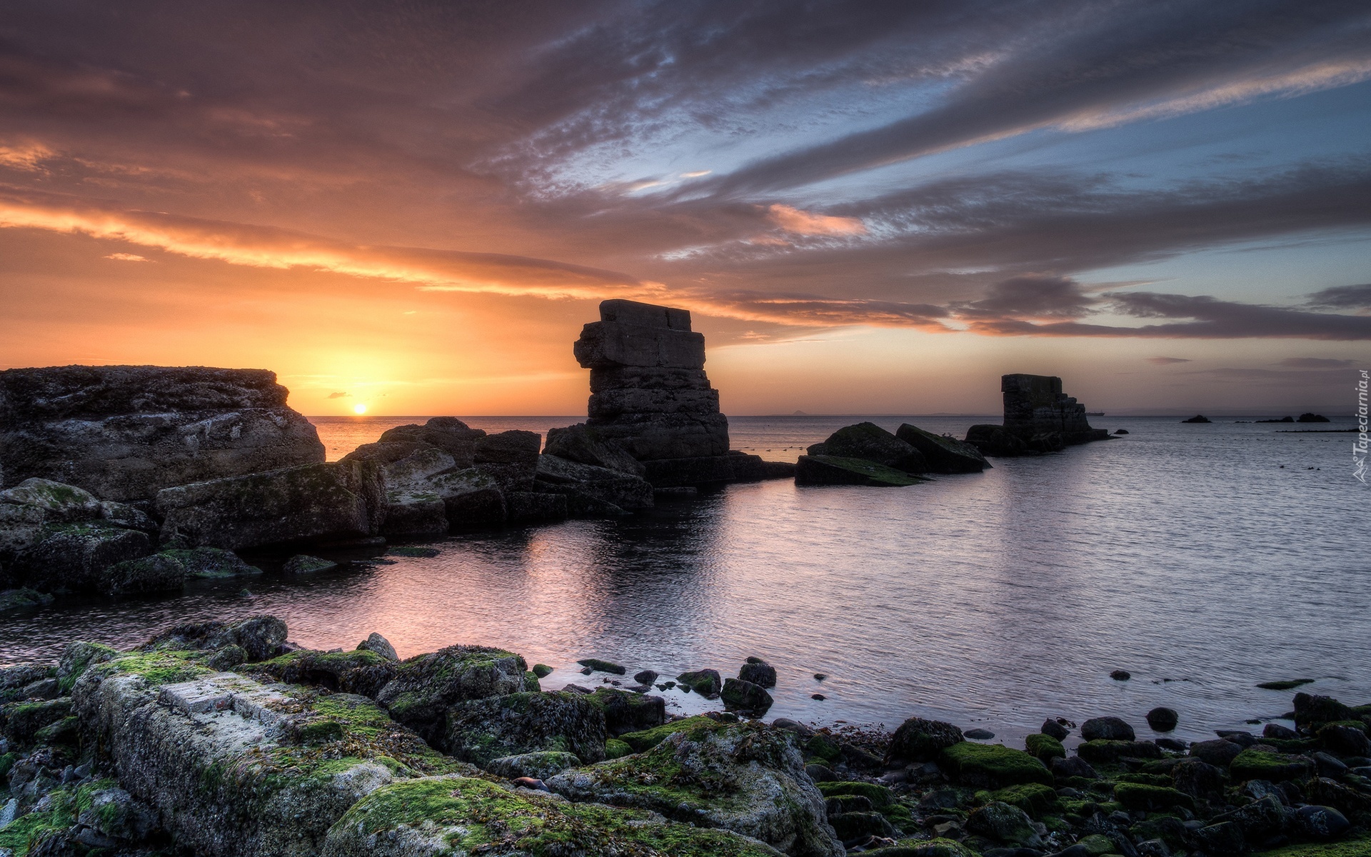 Edytor tapety: Morze, Zatoka, Zachód Słońca, Skały