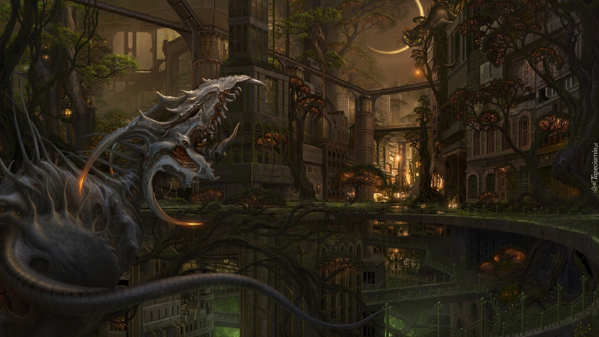 Edytor tapety: Potwór, Paszcza, Kamienice, Noc, Księżyc