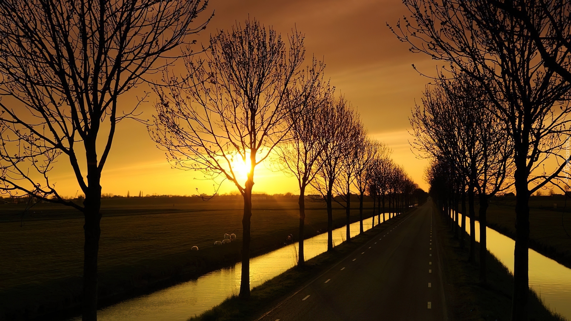 Edytor tapety: Droga, Zachód, Słońca, Drzewa, Rowy, Woda