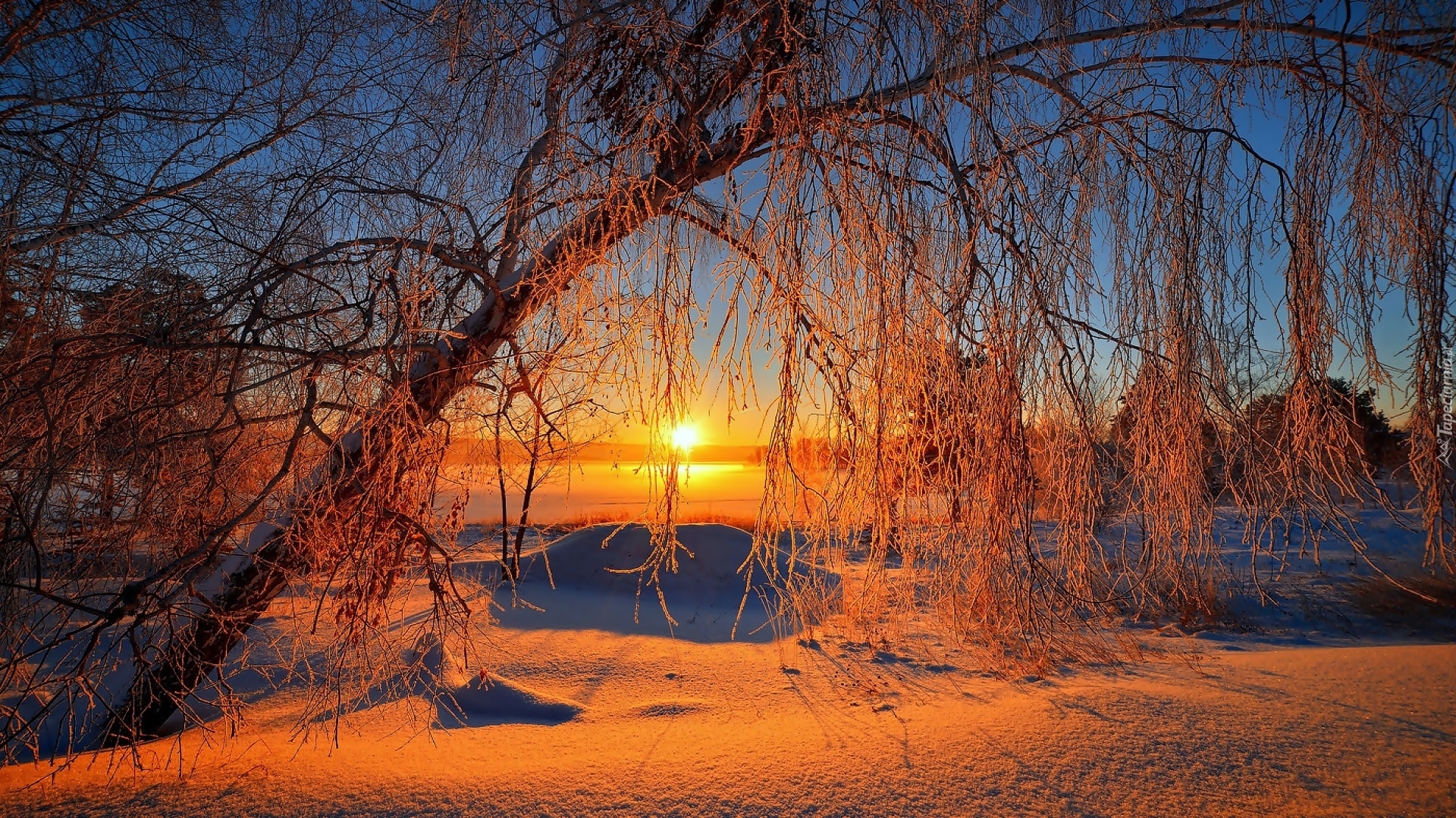 Edytor tapety: Wschód, Słońca, Pochyłe, Drzewo, Śnieg, Blask, Szron