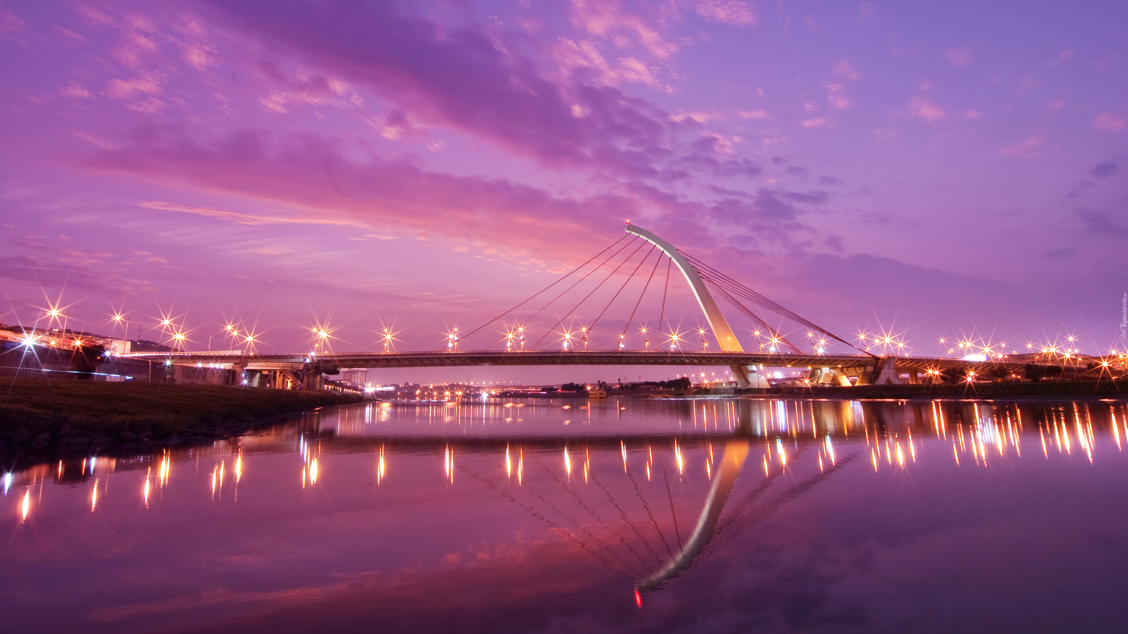 Edytor tapety: Rzeka Keelung, Oświetlony, Most, Dazhi Bridge, Chmury, Zachód słońca, Tajpej, Tajwan