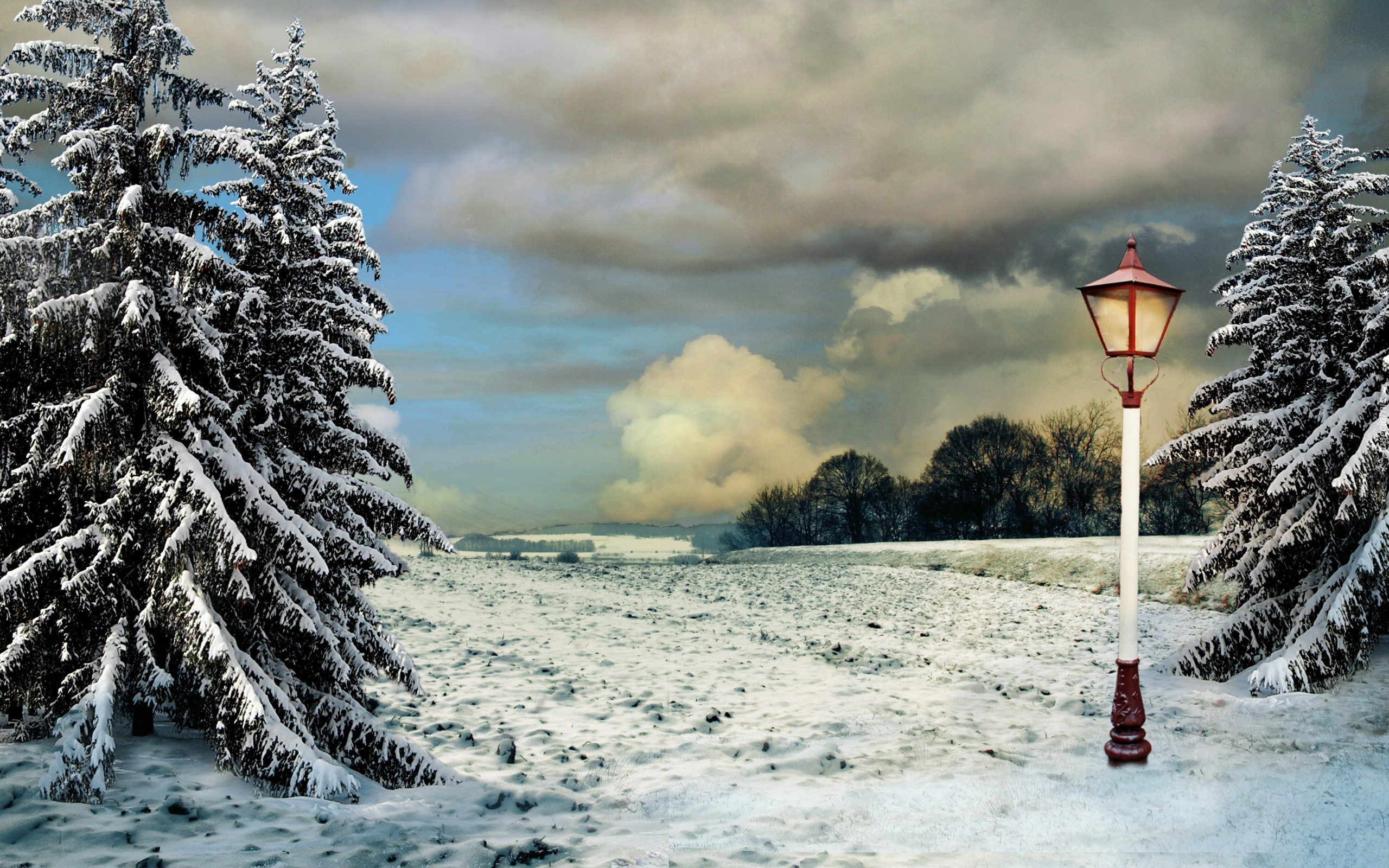 Edytor tapety: Pola, Lasy, Latarnia, Chmury, Zima, Świerki