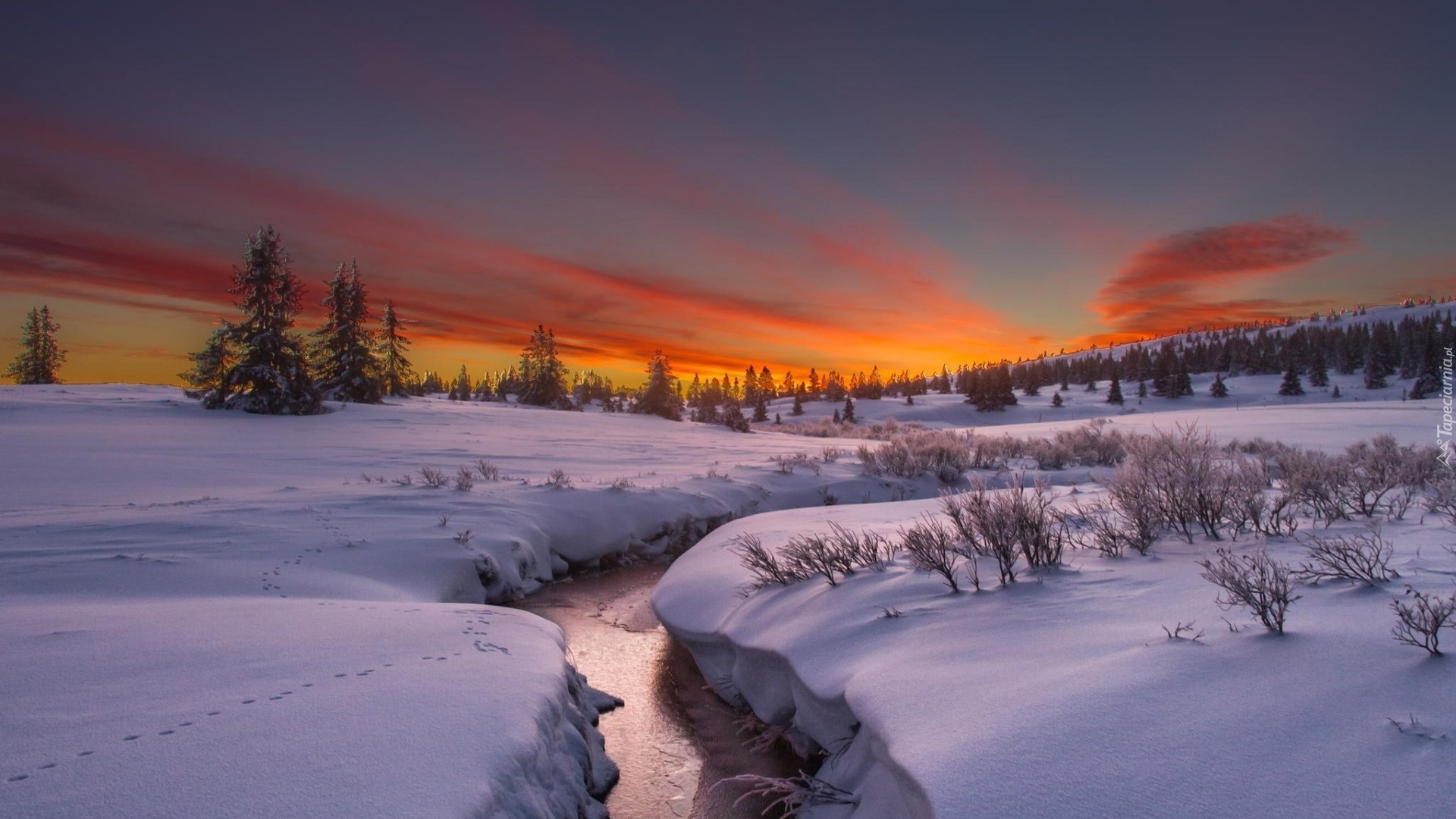 Edytor tapety: Pola, Rów, Zachód, Słońca, Drzewa, Śnieg