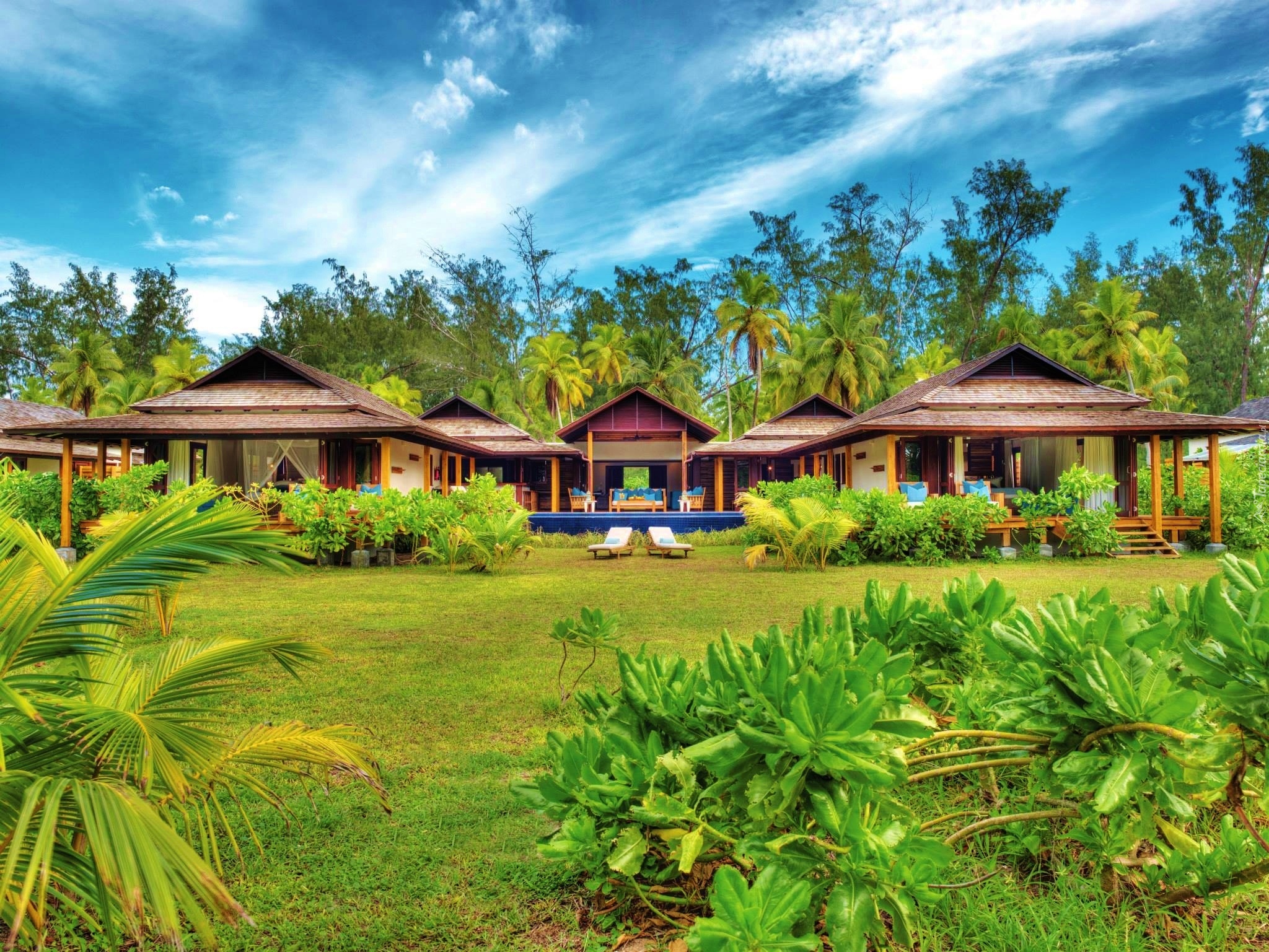 Edytor tapety: Domki, Palmy, Niebo