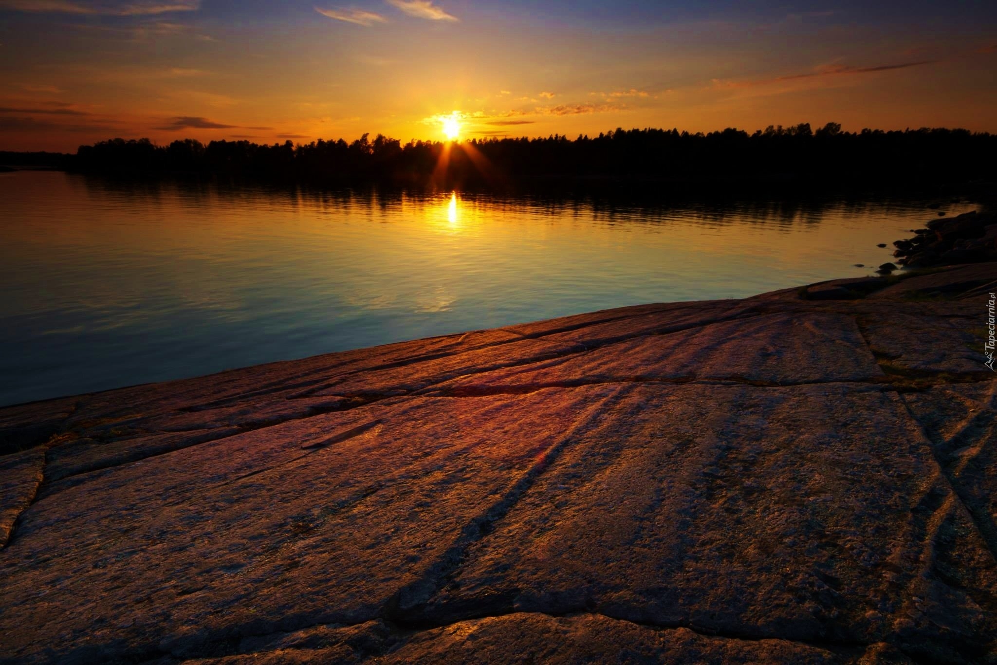 Edytor tapety: Zachód, Słońca, Jezioro, Skała