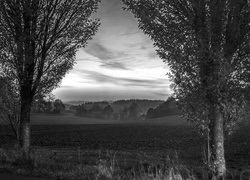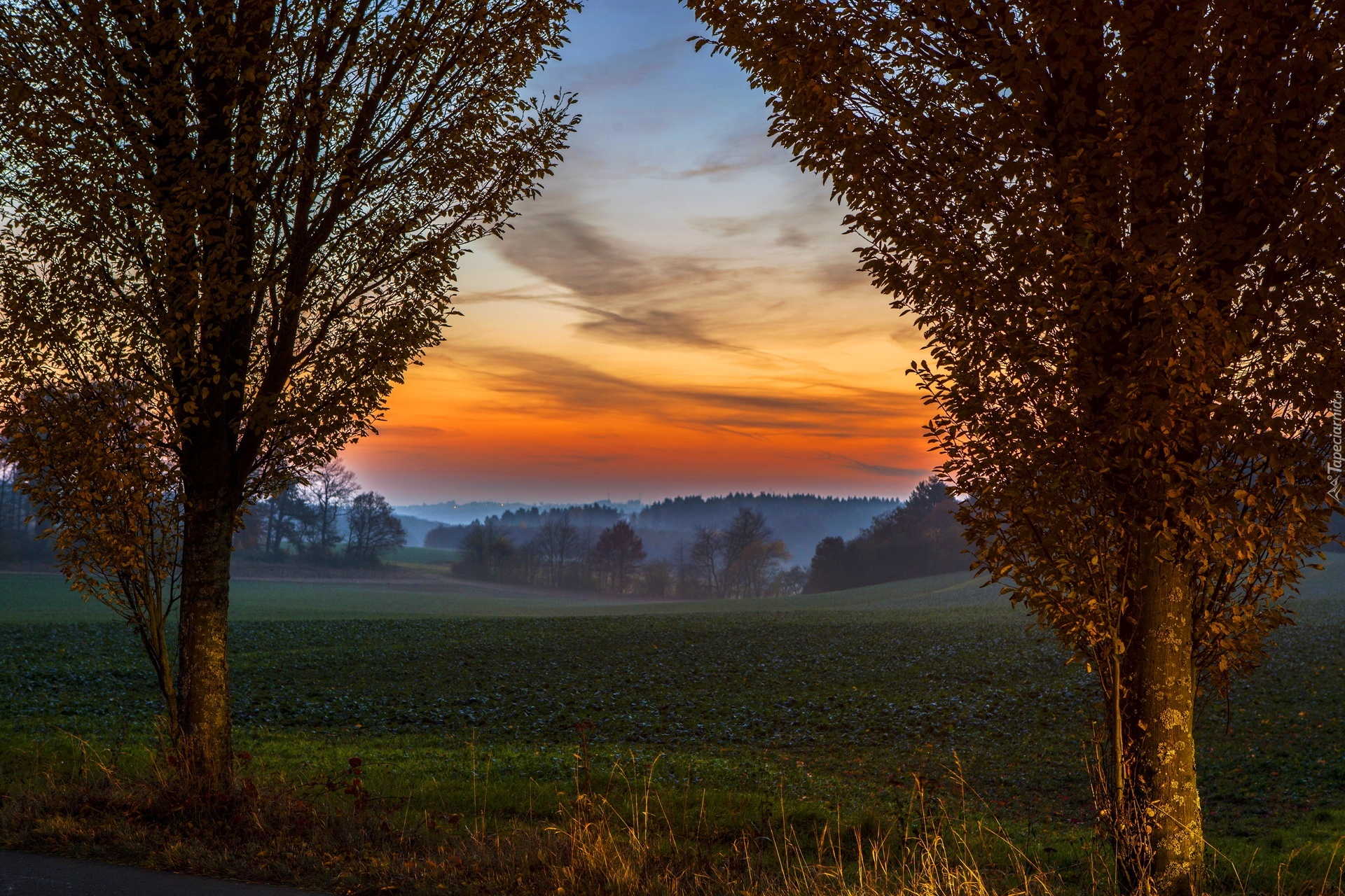 Edytor tapety: Wschód, Słońca, Pola, Mgła, Drzewa