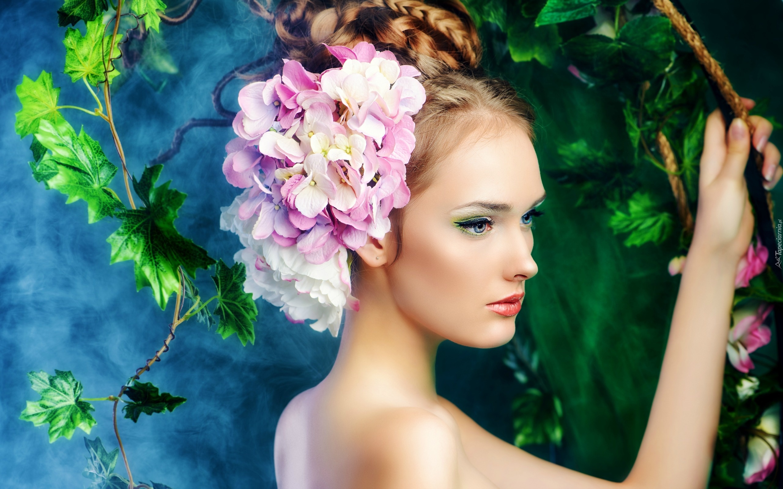 Edytor tapety: Kobieta, Kwiaty, We, Włosach, Liście, Ogród