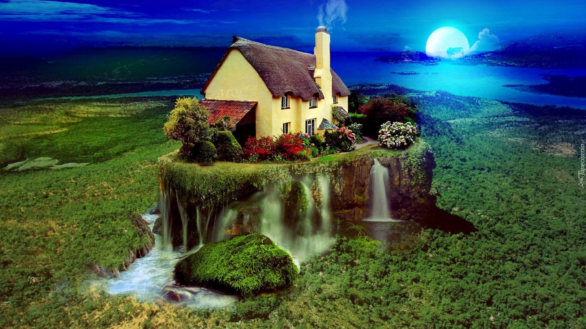 Edytor tapety: Domek, Wodospad, Roślinność