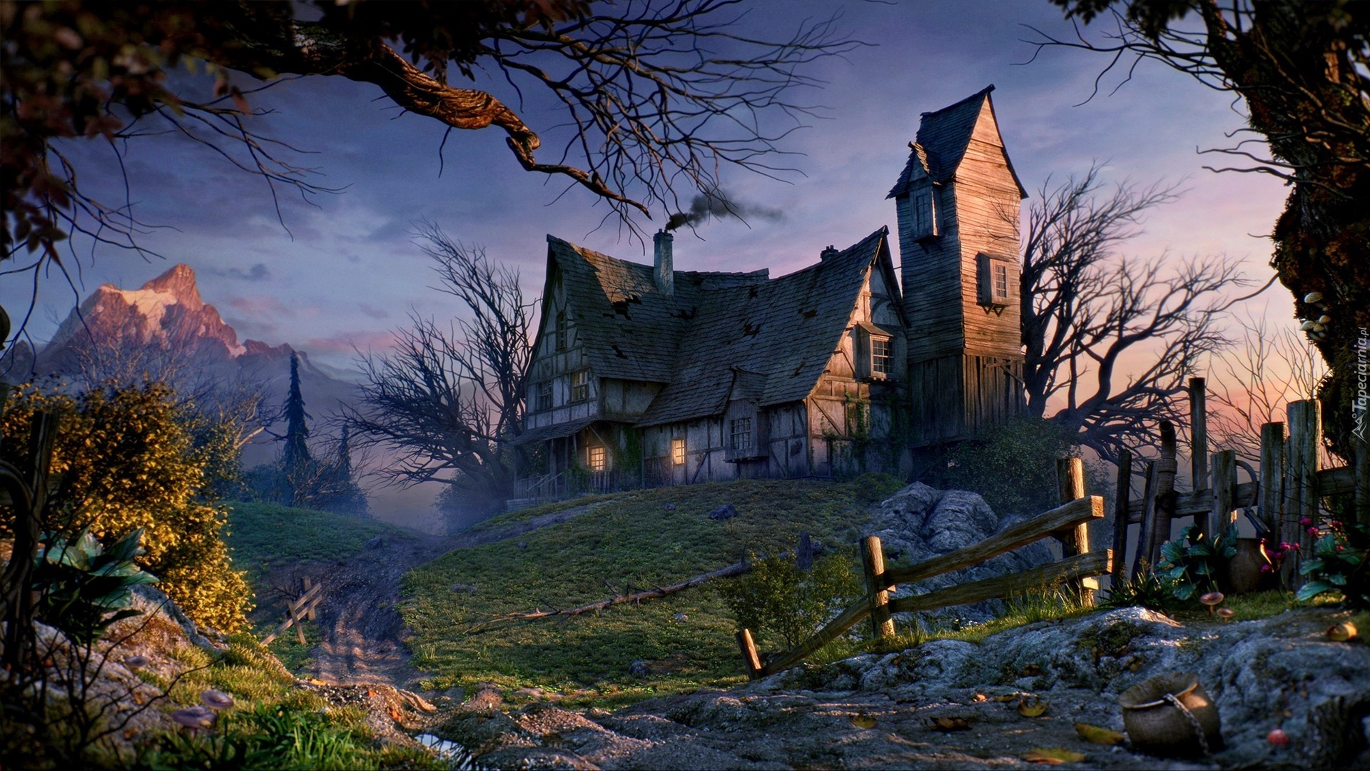 Edytor tapety: Domek, Drzewa, Płot, Rośliny
