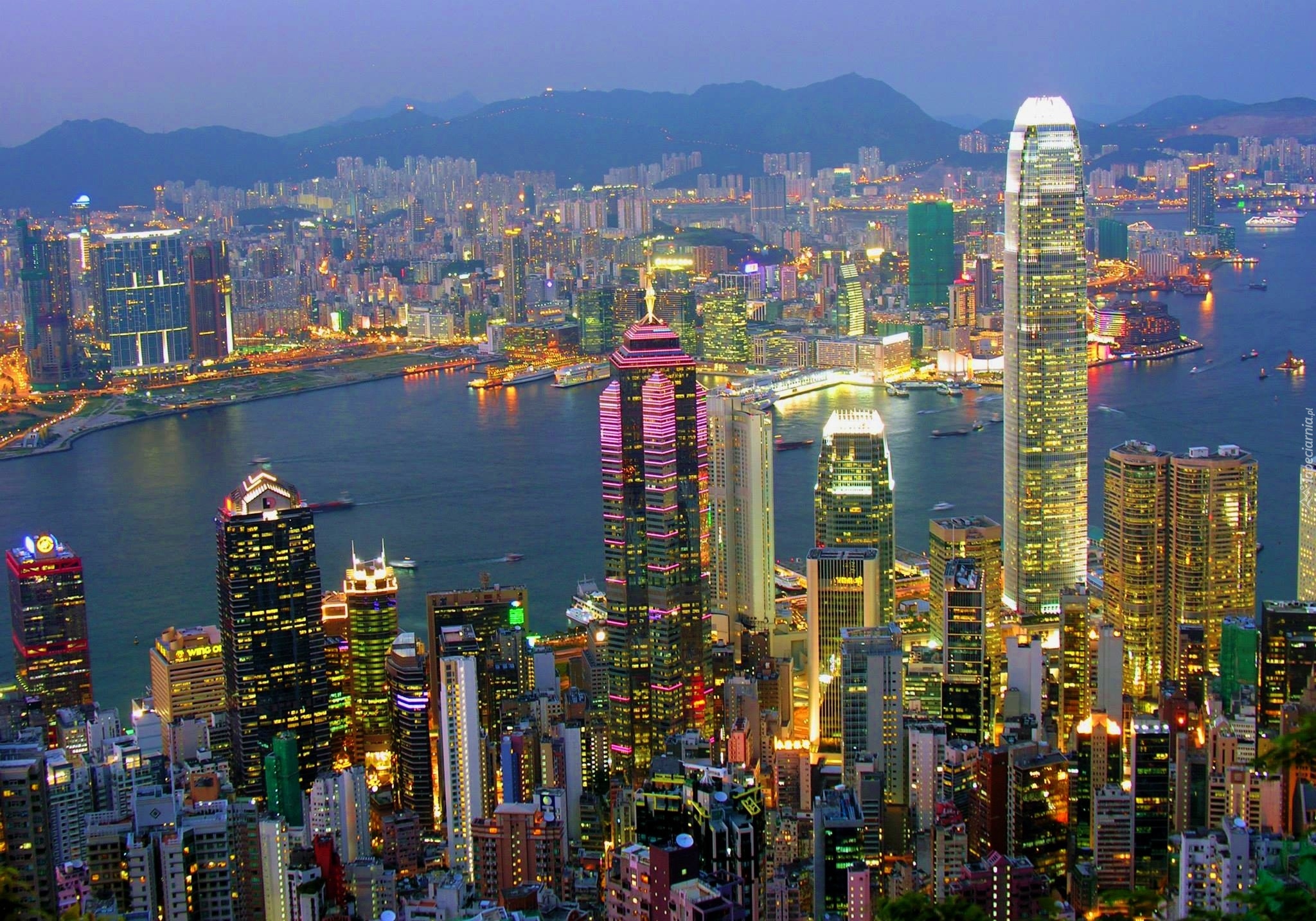 Edytor tapety: Wieżowce, Rzeka, Noc, Hongkong, Chiny