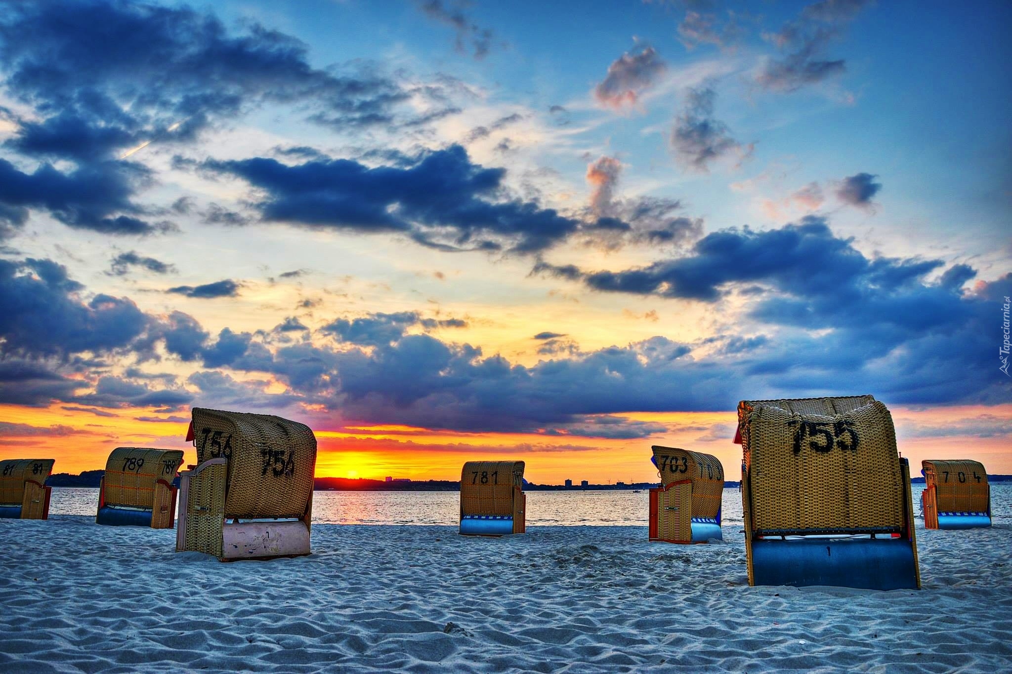 Edytor tapety: Zachód, Słońca, Plaża, Kosze