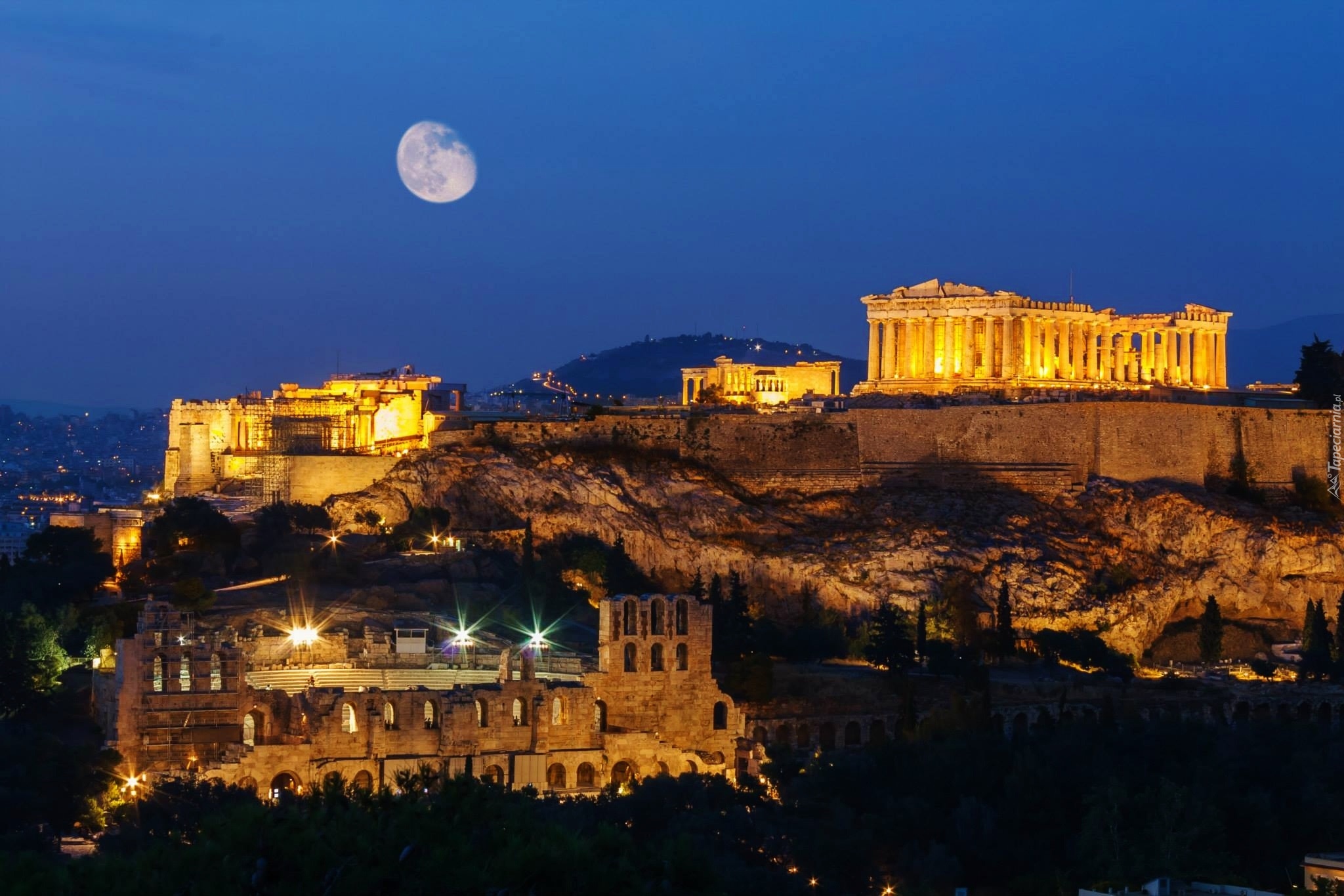 Edytor tapety: Akropol ateński, Ruiny, Ateny, Grecja, Księżyc, Noc
