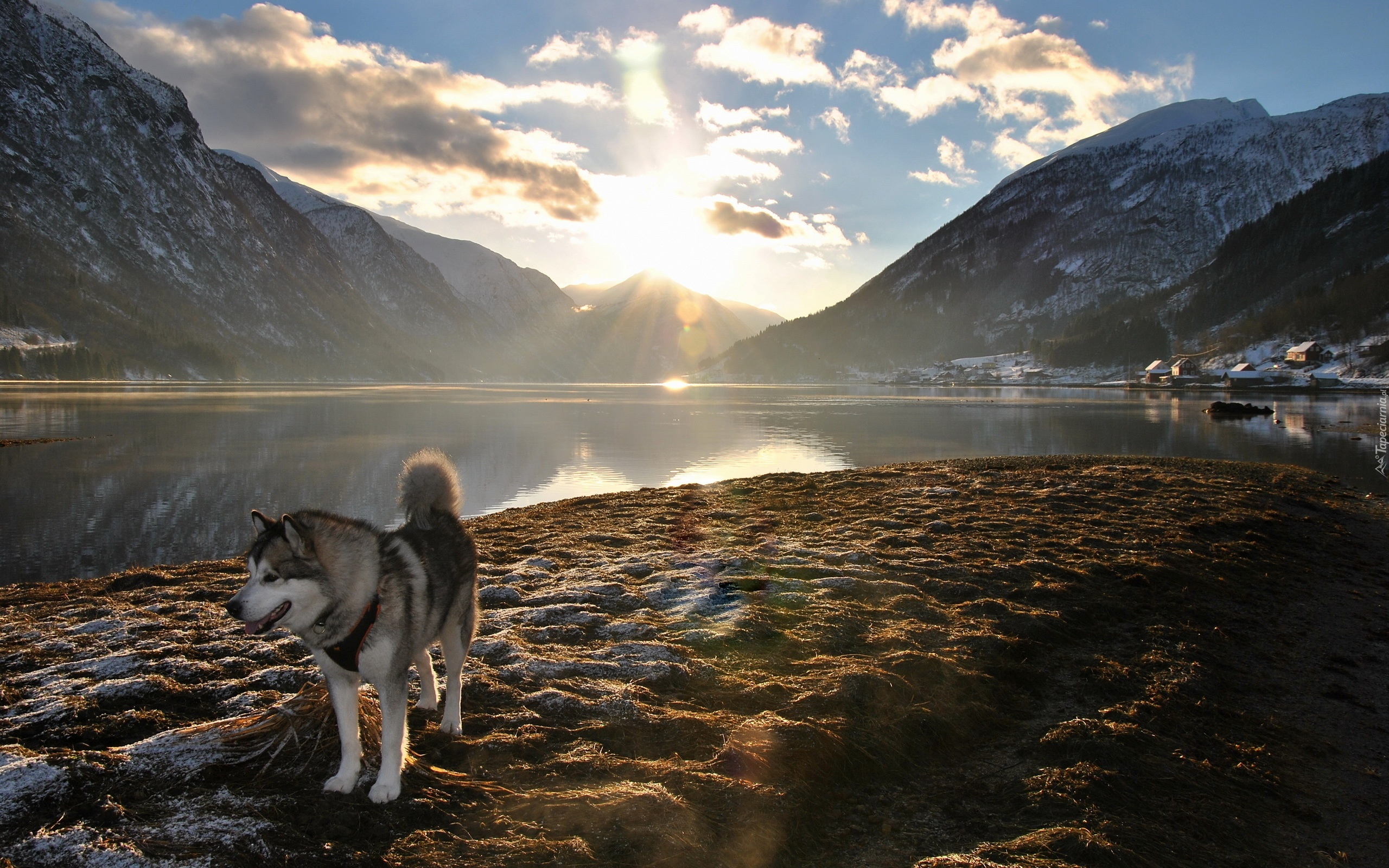 Edytor tapety: Husky, Jezioro, Góry, Promienie, Słońca, Chmury