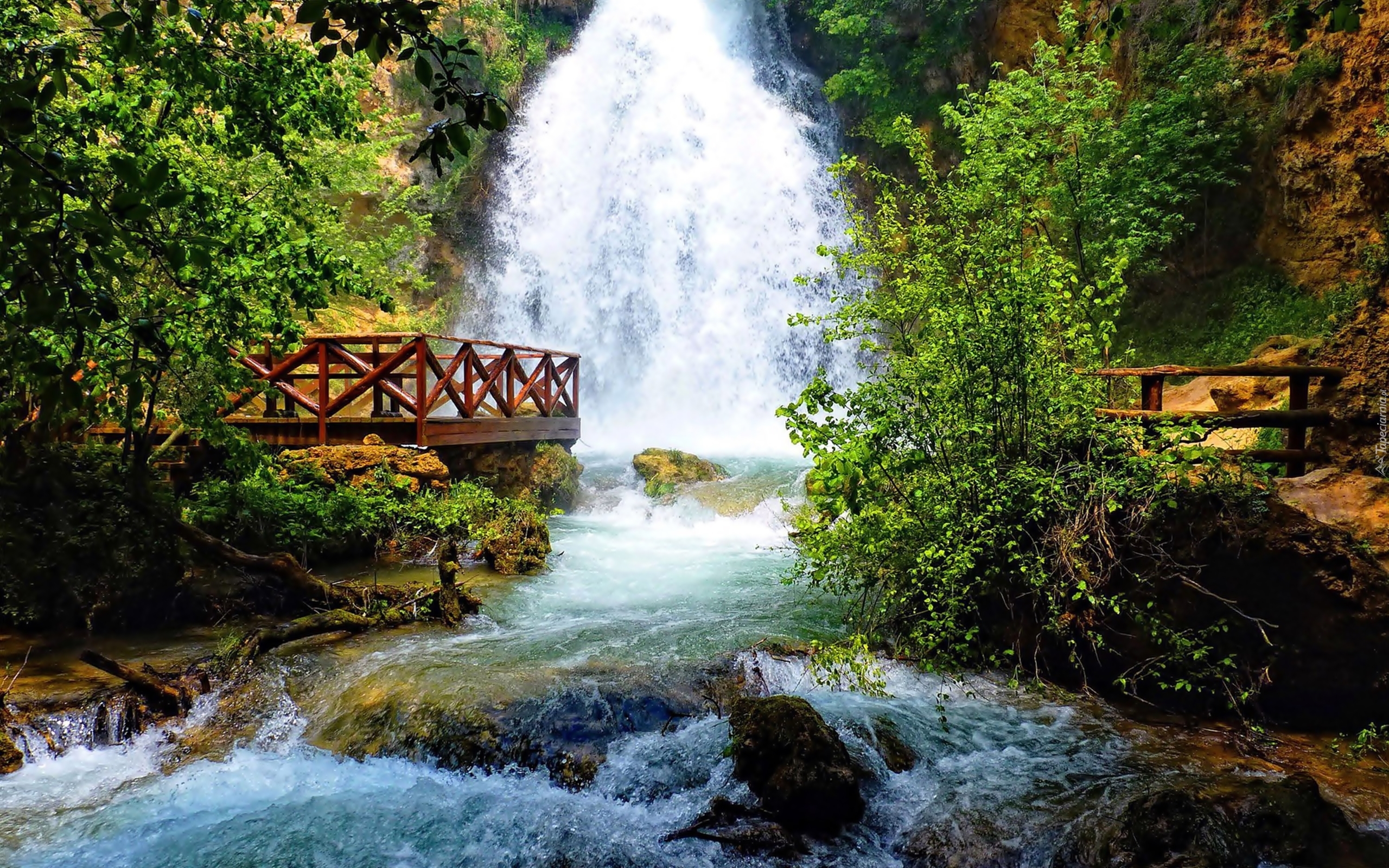 Edytor tapety: Wodospad, Rzeka, Kamienie, Drzewa, Pomost