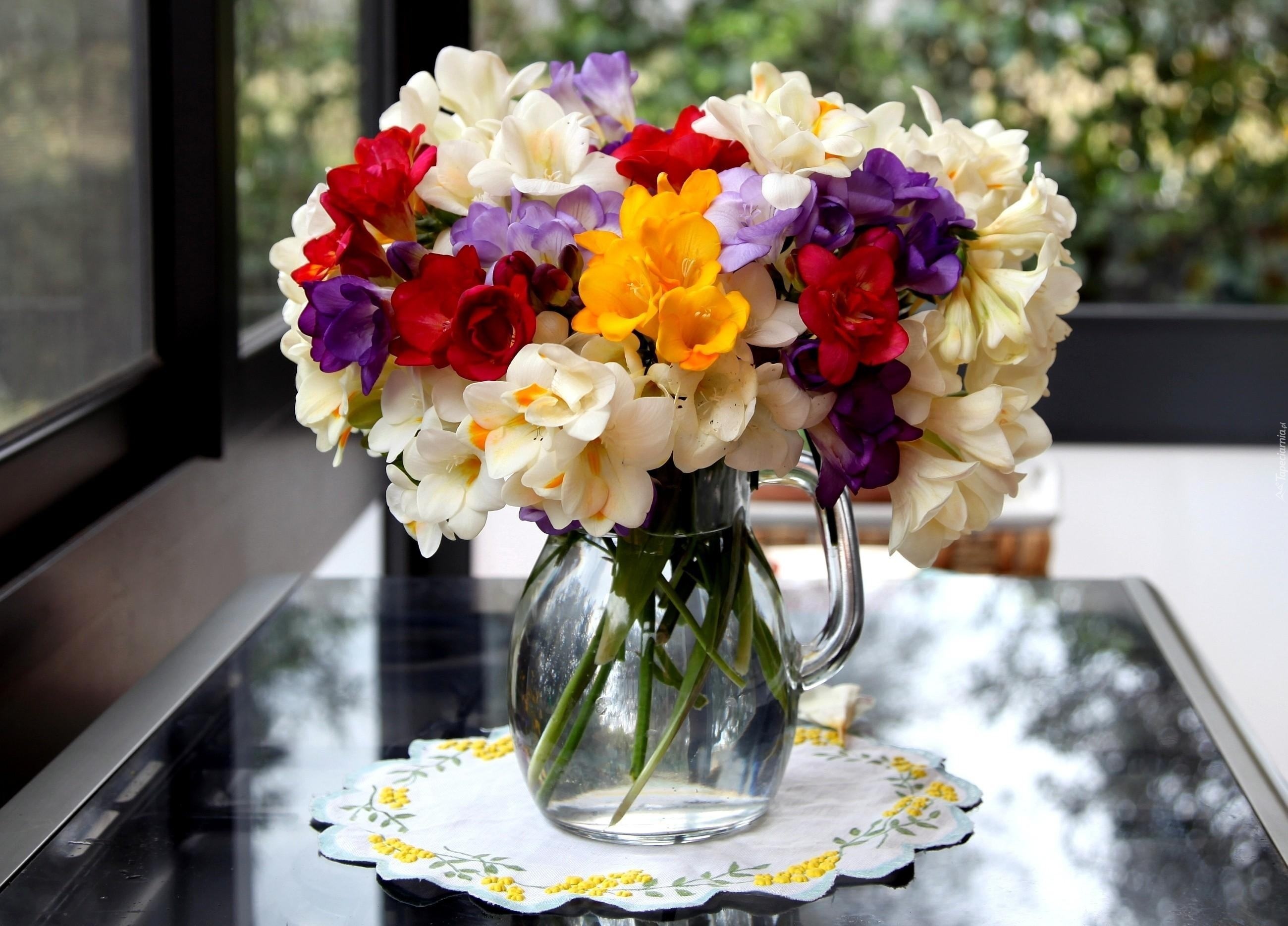 Edytor tapety: Bukiet, Kwiaty, Frezje, Dzbanek, Serwetka
