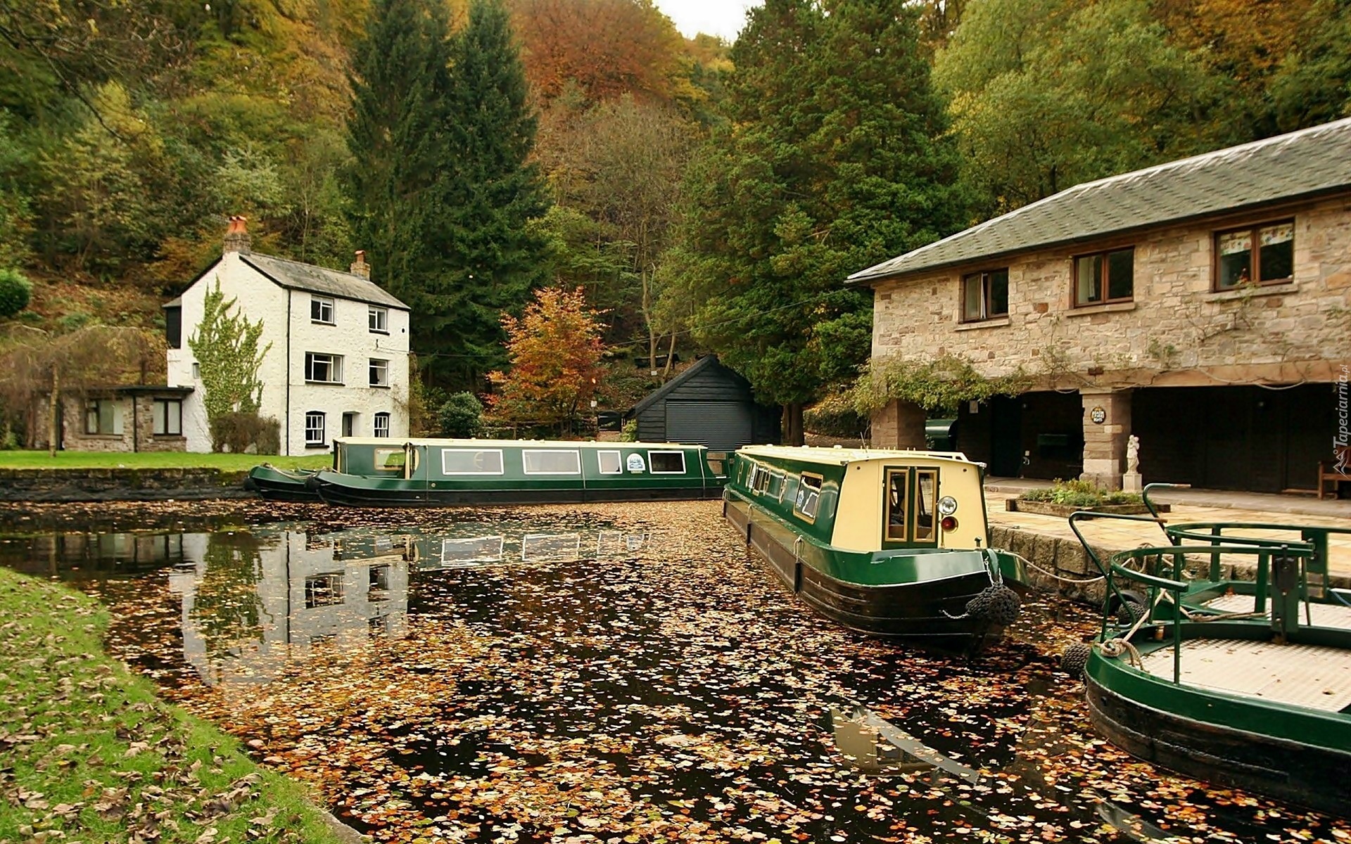 Edytor tapety: Las, Domy, Rzeka, Łodzie, Opadłe, Liście