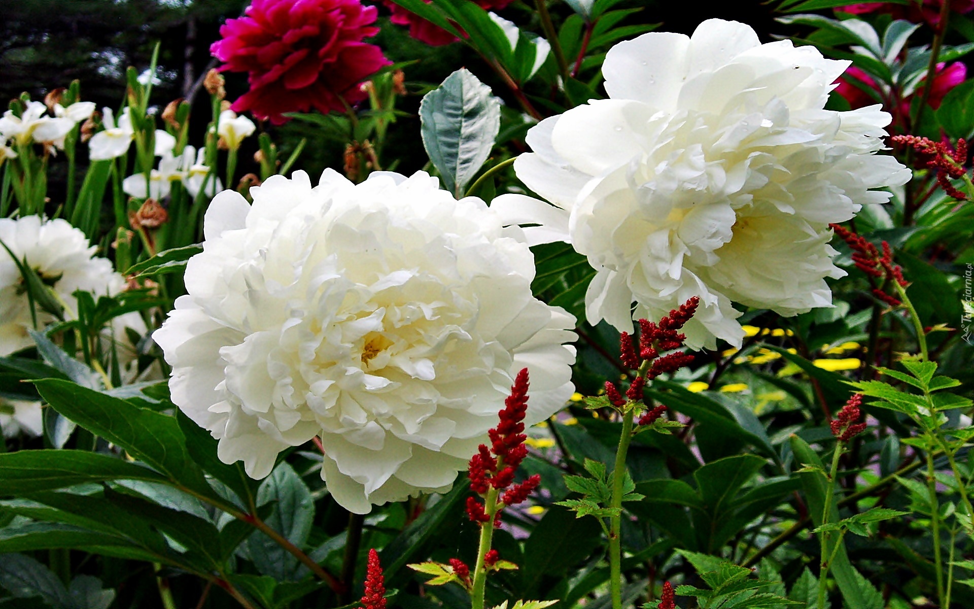 Edytor tapety: Białe, Piwonie, Ogródek, Rozmycie