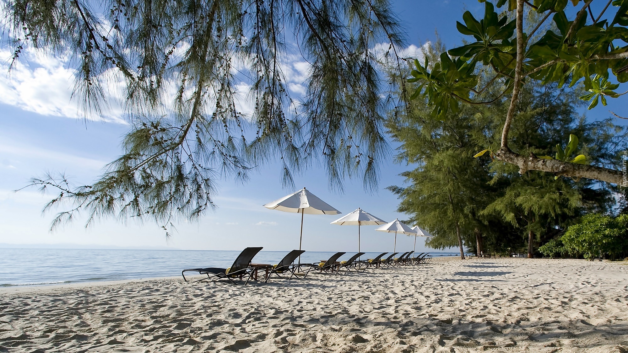Edytor tapety: Tajlandia, Morze, Plaża, Leżaki, Roślinność, Wakacje, Parasole