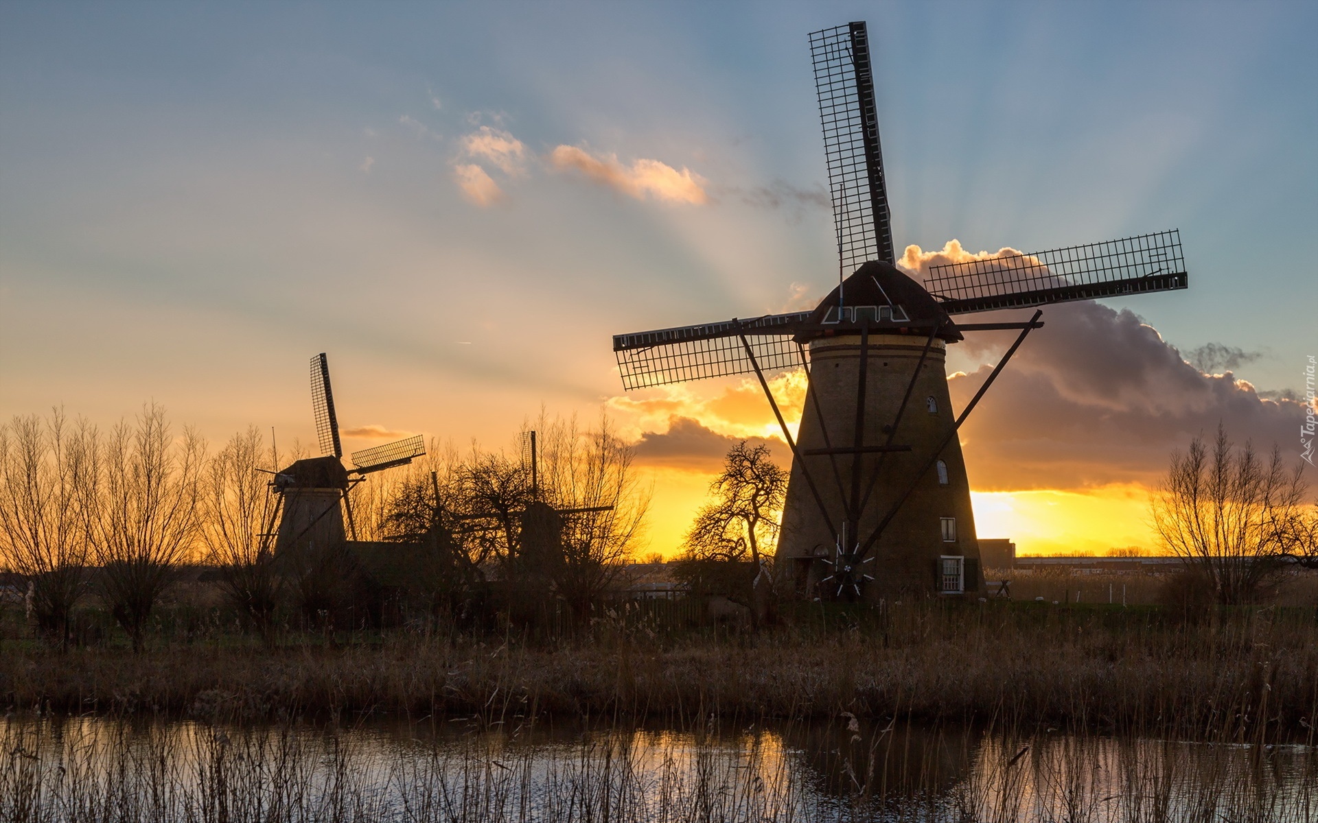 Edytor tapety: Wiatraki, Chmury, Zachód, Słońca, Rzeka