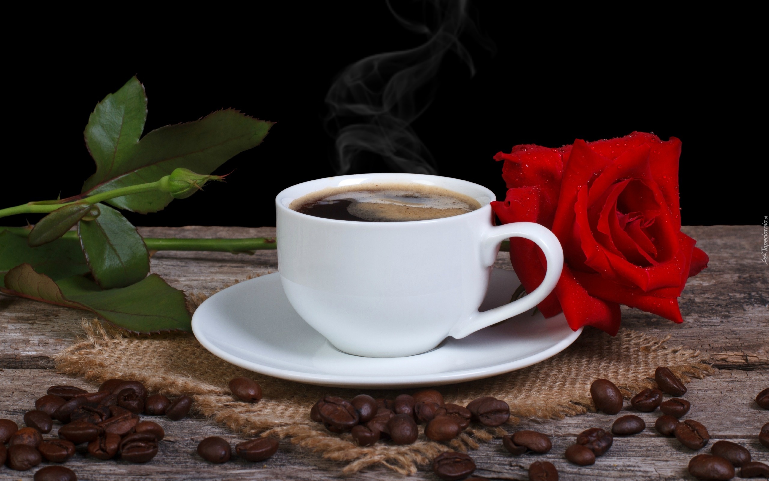 Edytor tapety: Róża, Filiżanka, Kawy, Ziarna, Ławka, Kompozycja