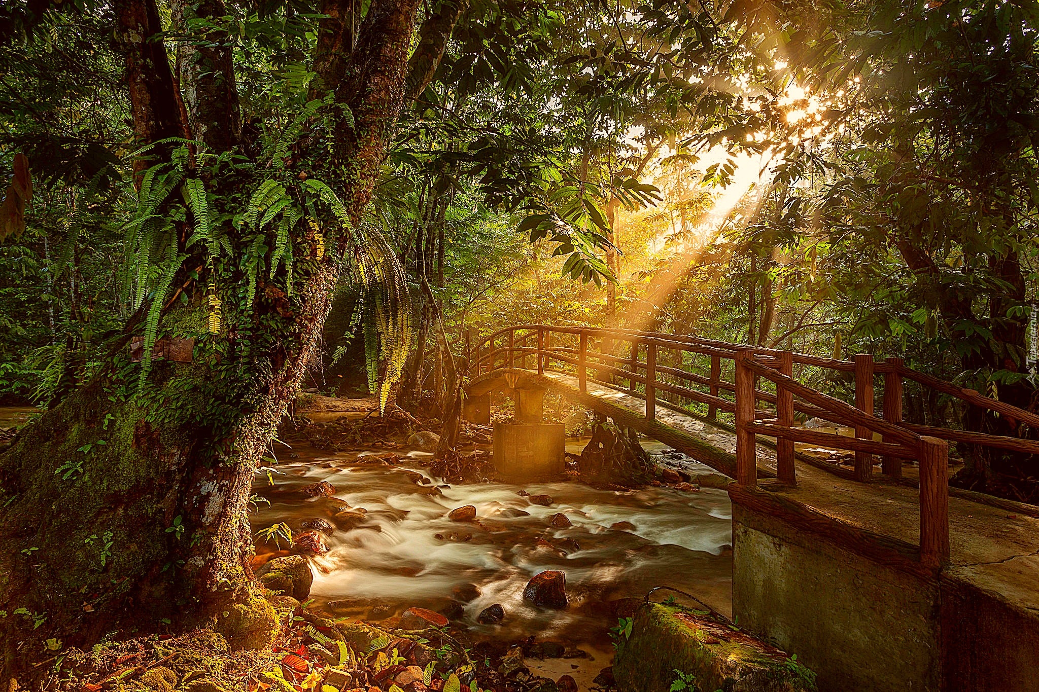 Edytor tapety: Las, Rzeka, Most, Przebijające Światło, Mgła