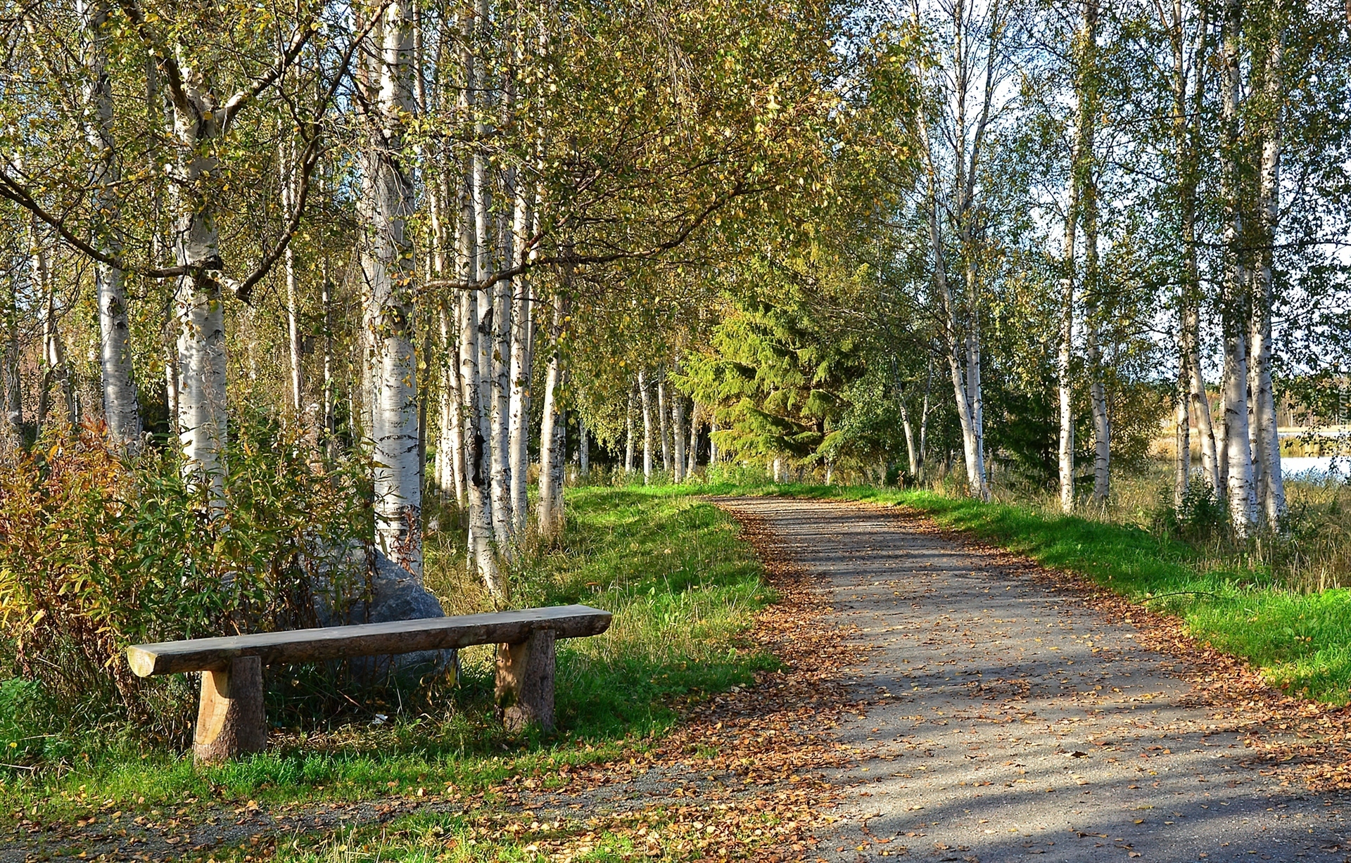 Edytor tapety: Park, Droga, Ławeczka, Brzozy